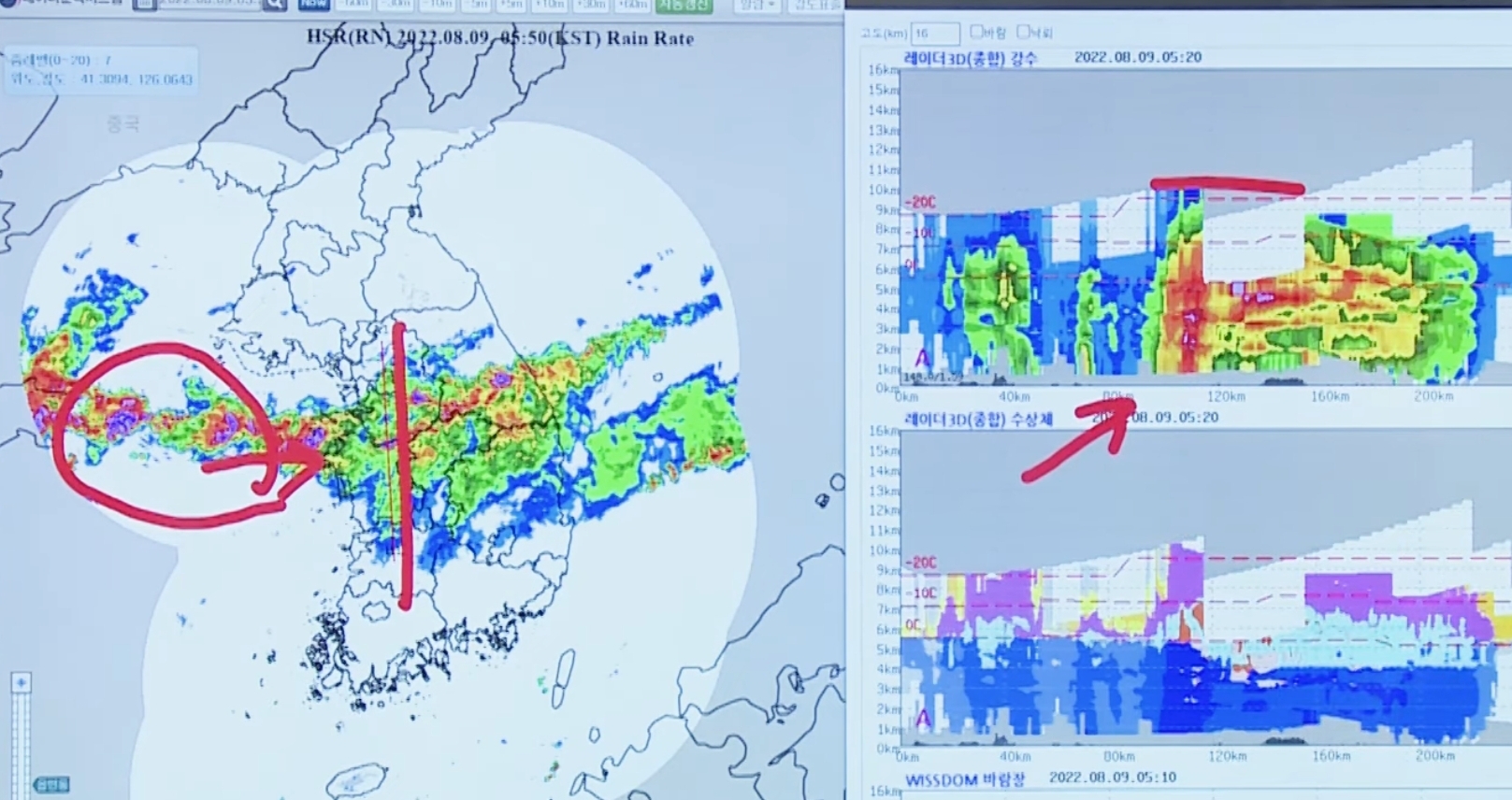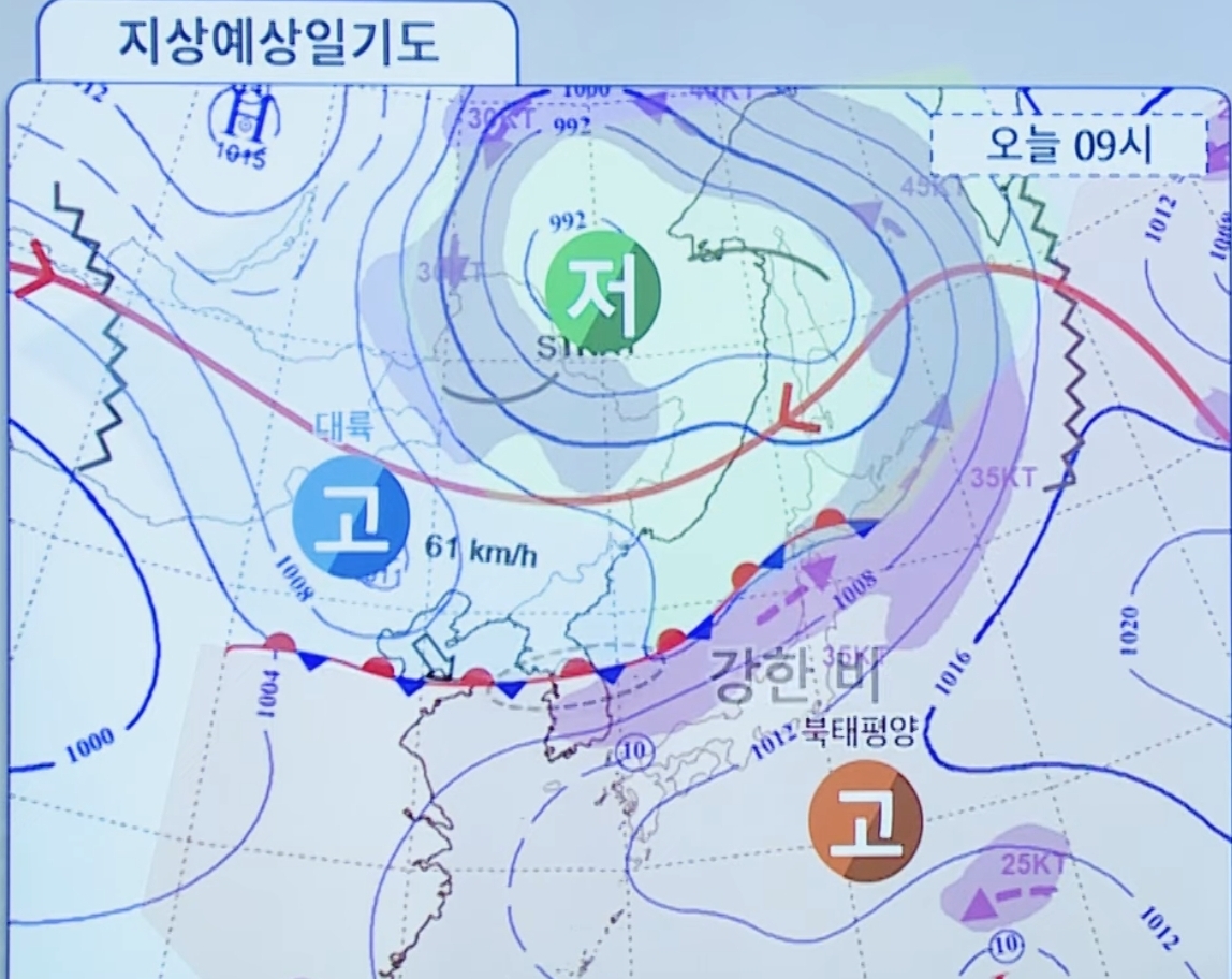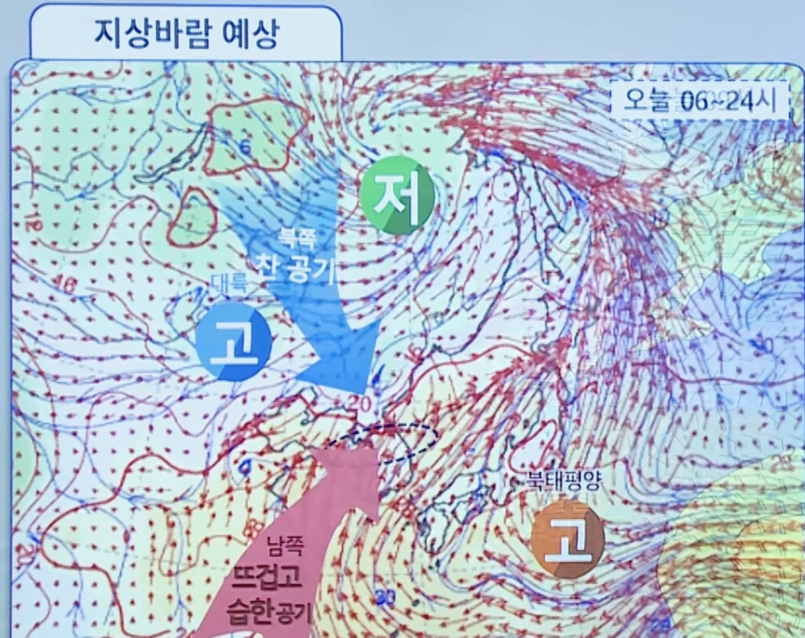 남해 먼바다에서 불어오는 덥고 슾한 공기와, 만주지역에서불어오는 찬 공기가 만났다고 합니다.