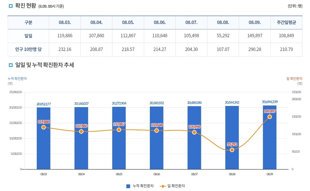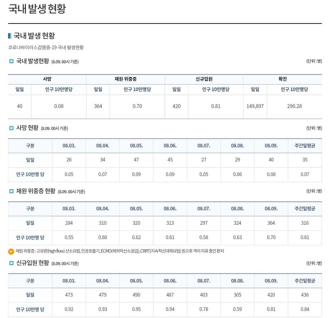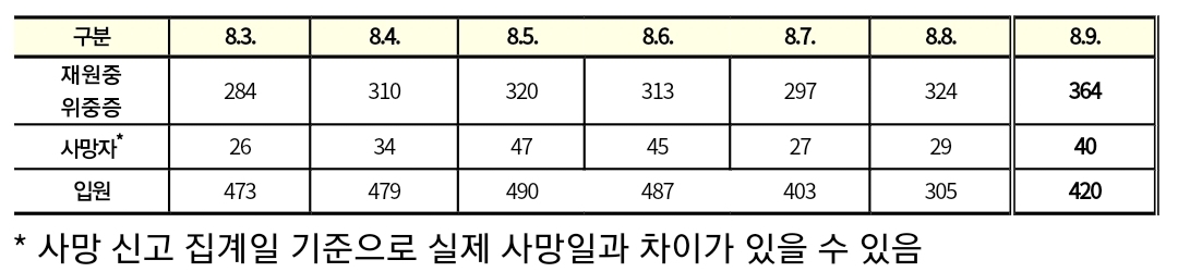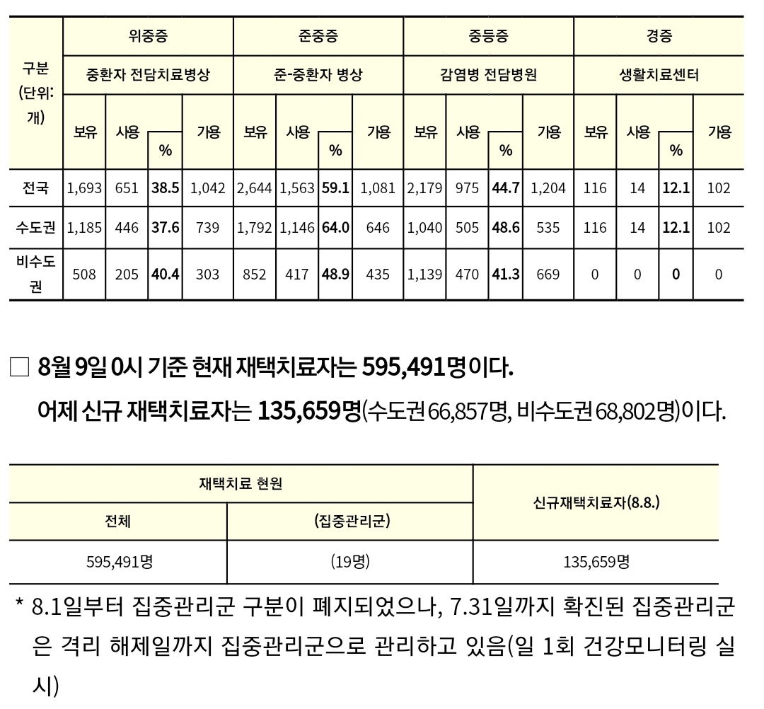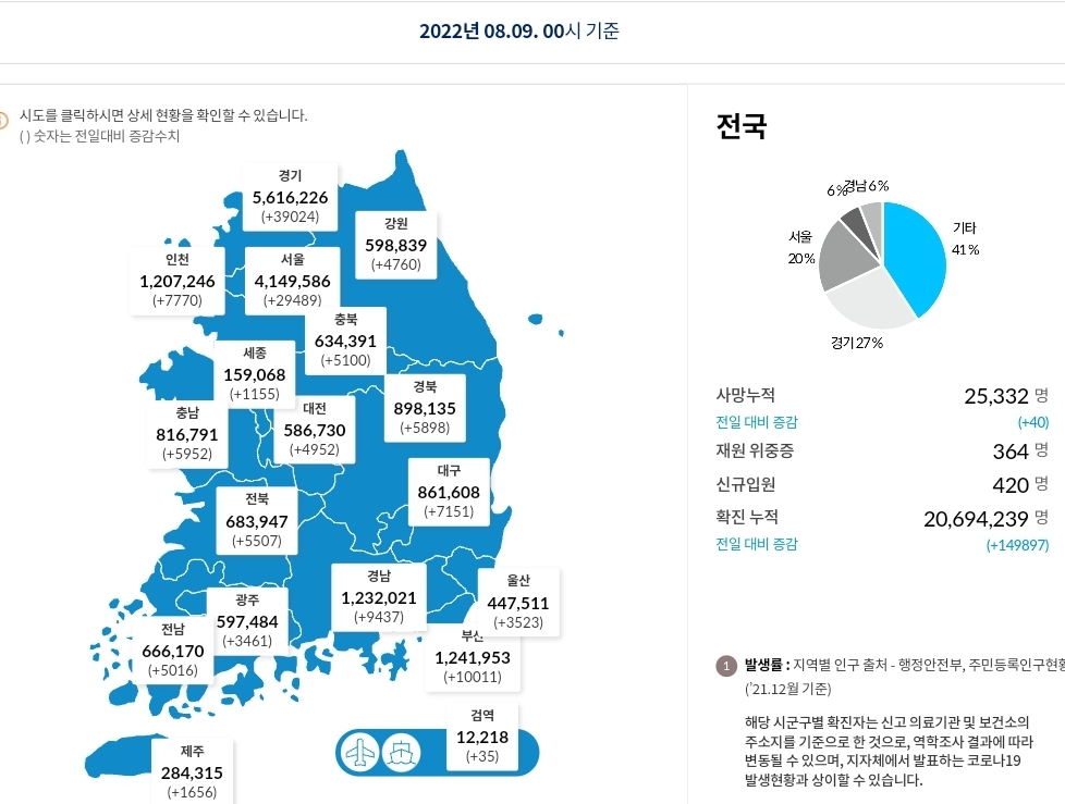 코로나19집계(2022.8.9. 0시기준) 확진 +15만, 사망 +40, 위중중병상가동률 38%, 재택치료 60만 본문
