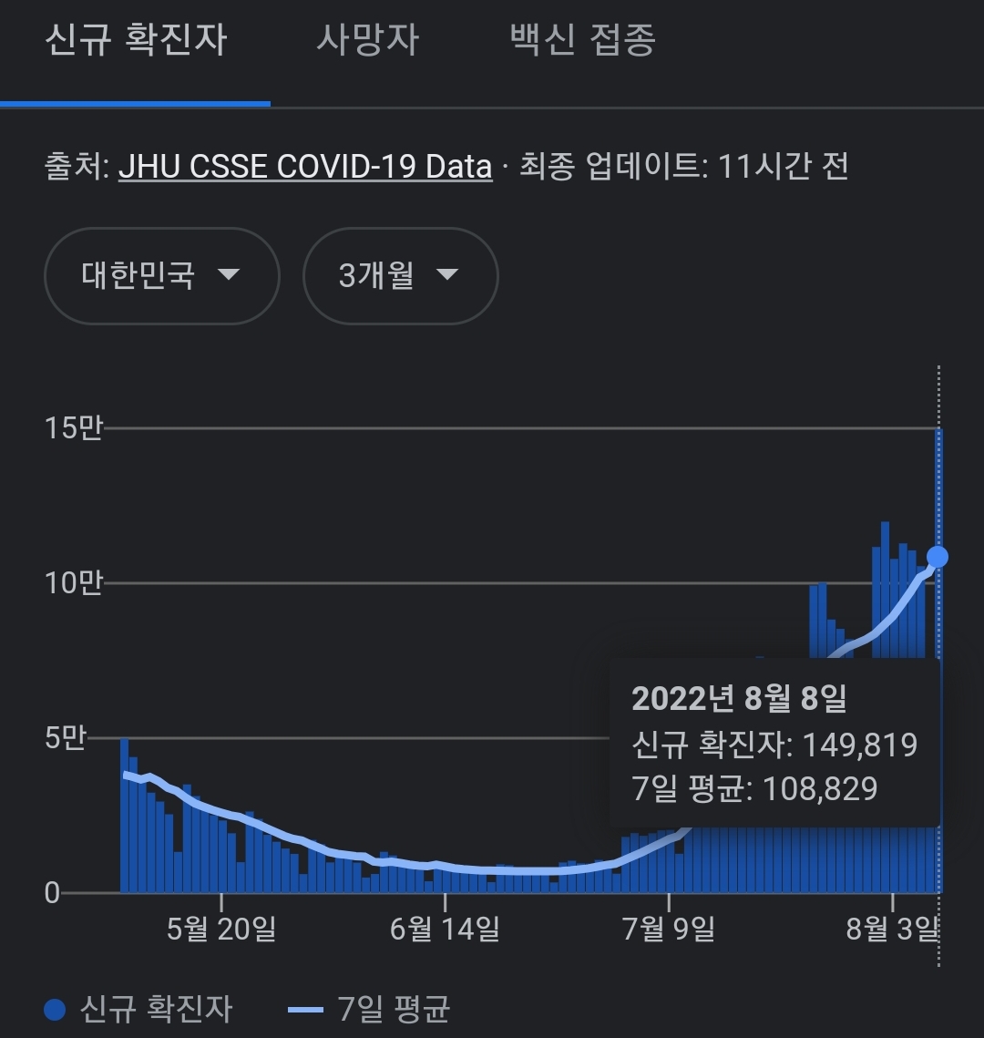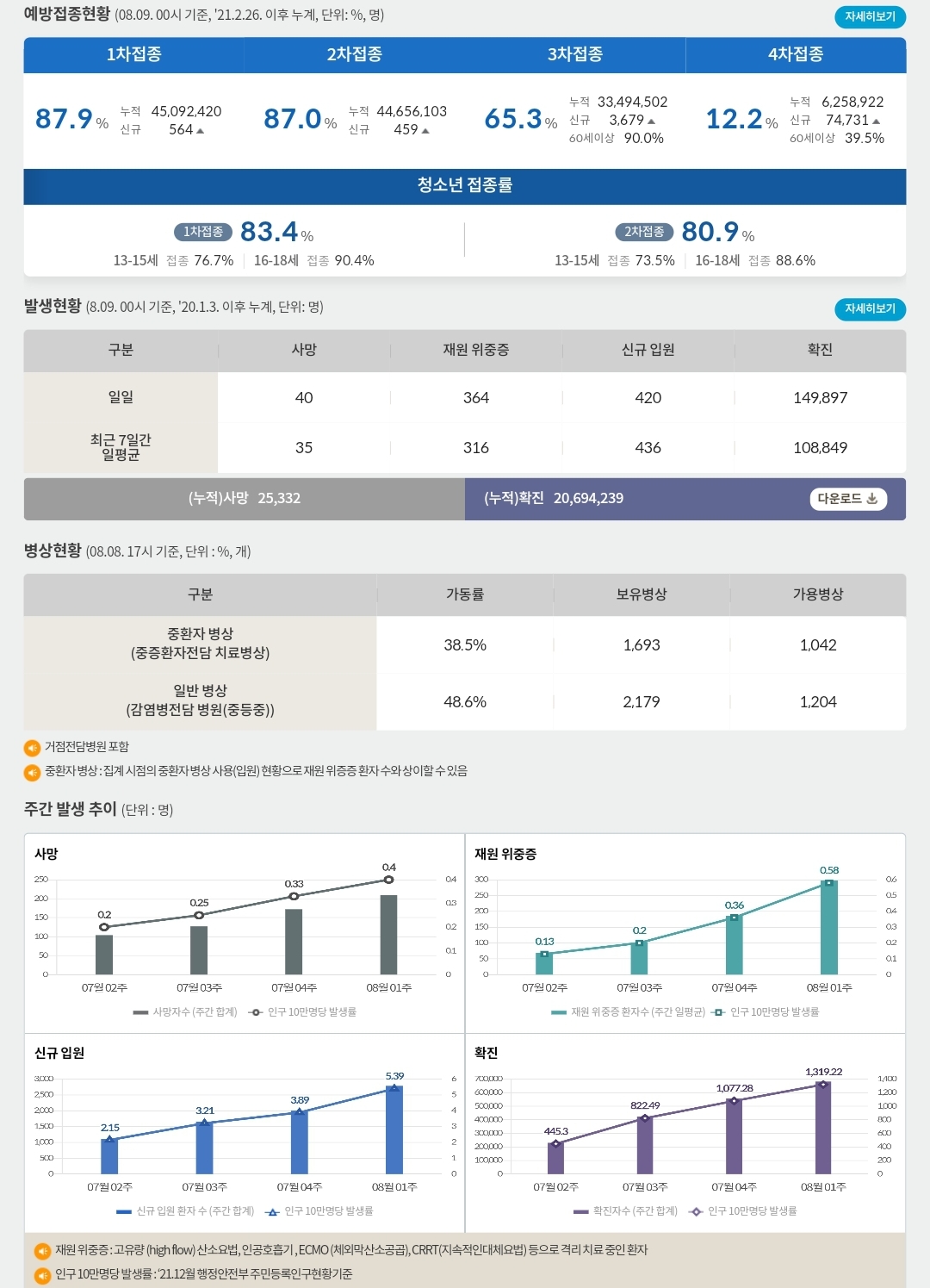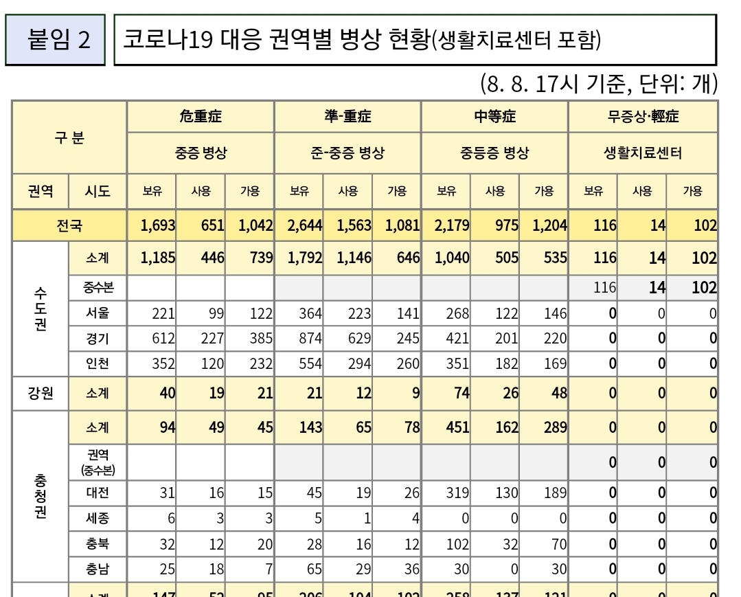 코로나19집계(2022.8.9. 0시기준) 확진 +15만, 사망 +40, 위중중병상가동률 38%, 재택치료 60만 본문