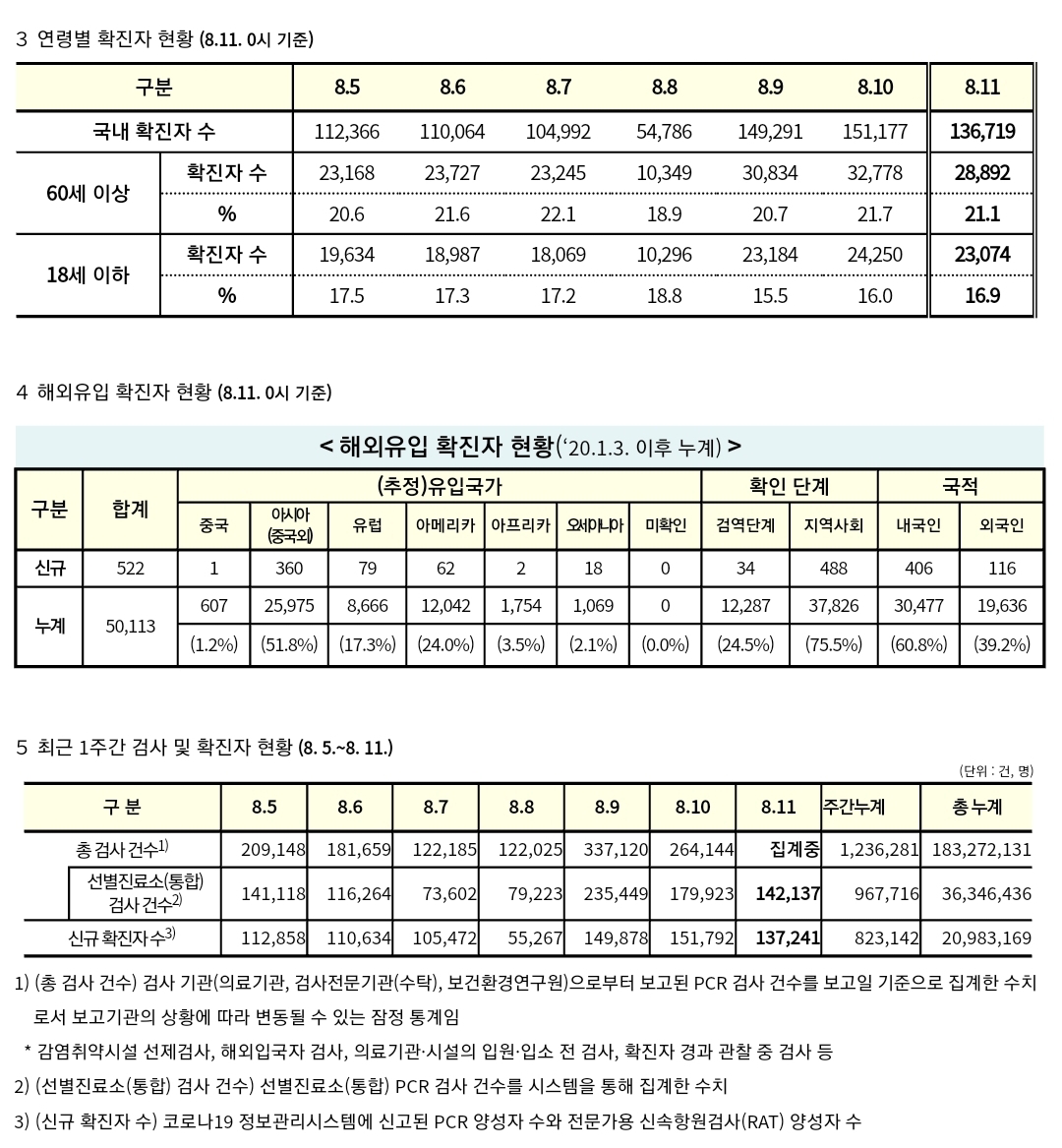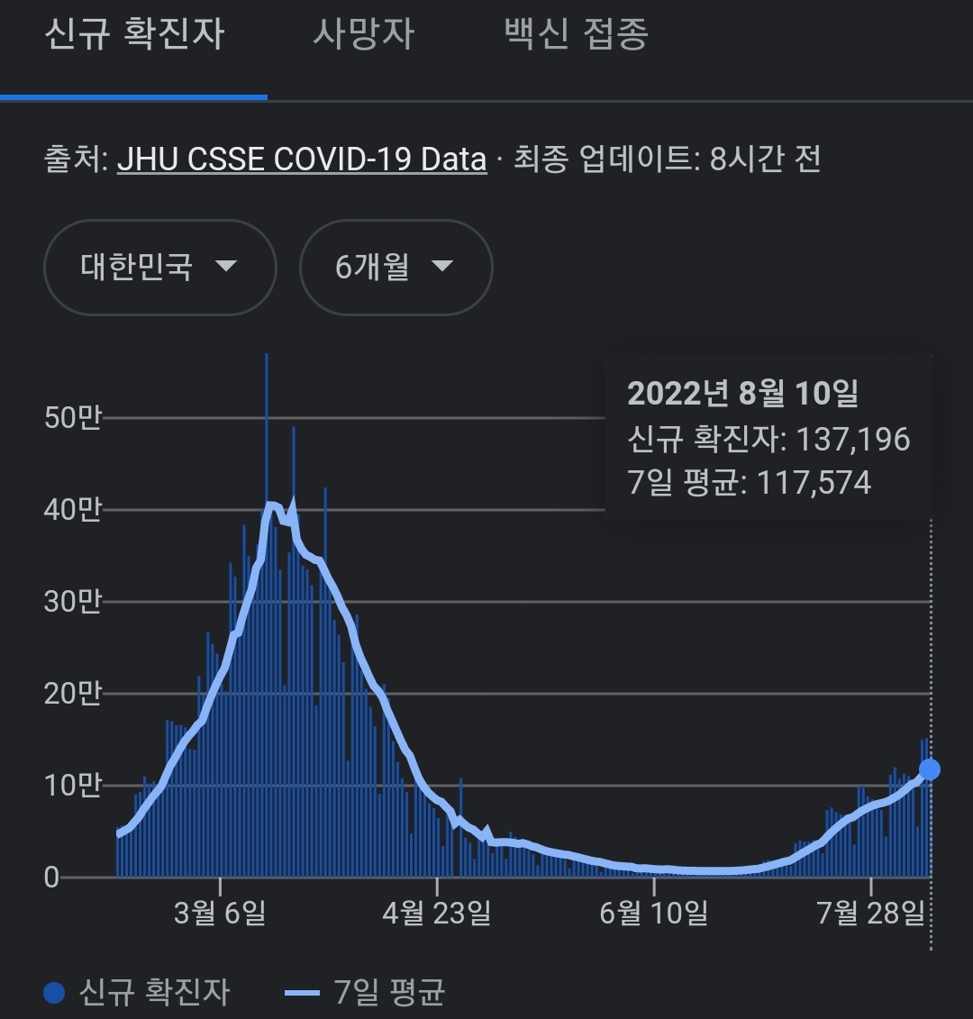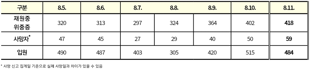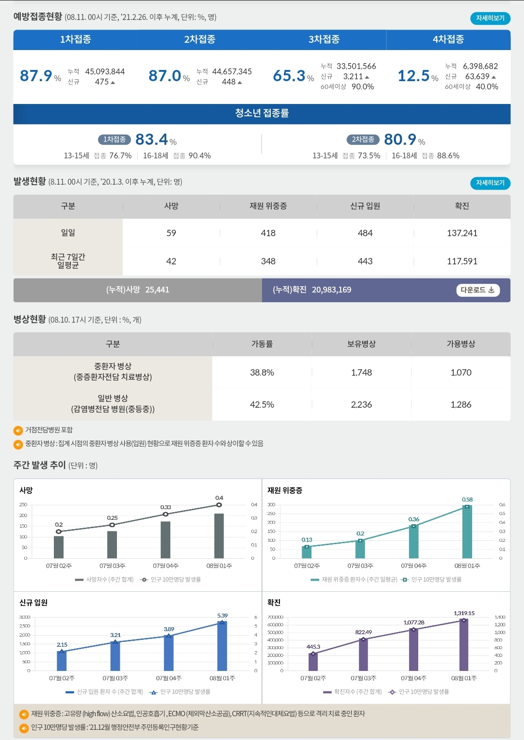 코로나19집계(2022.8.11. 0시기준) 확진 +14만, 사망 +59명, 위중증병상가동률 39%, 재택치료 67만 본문