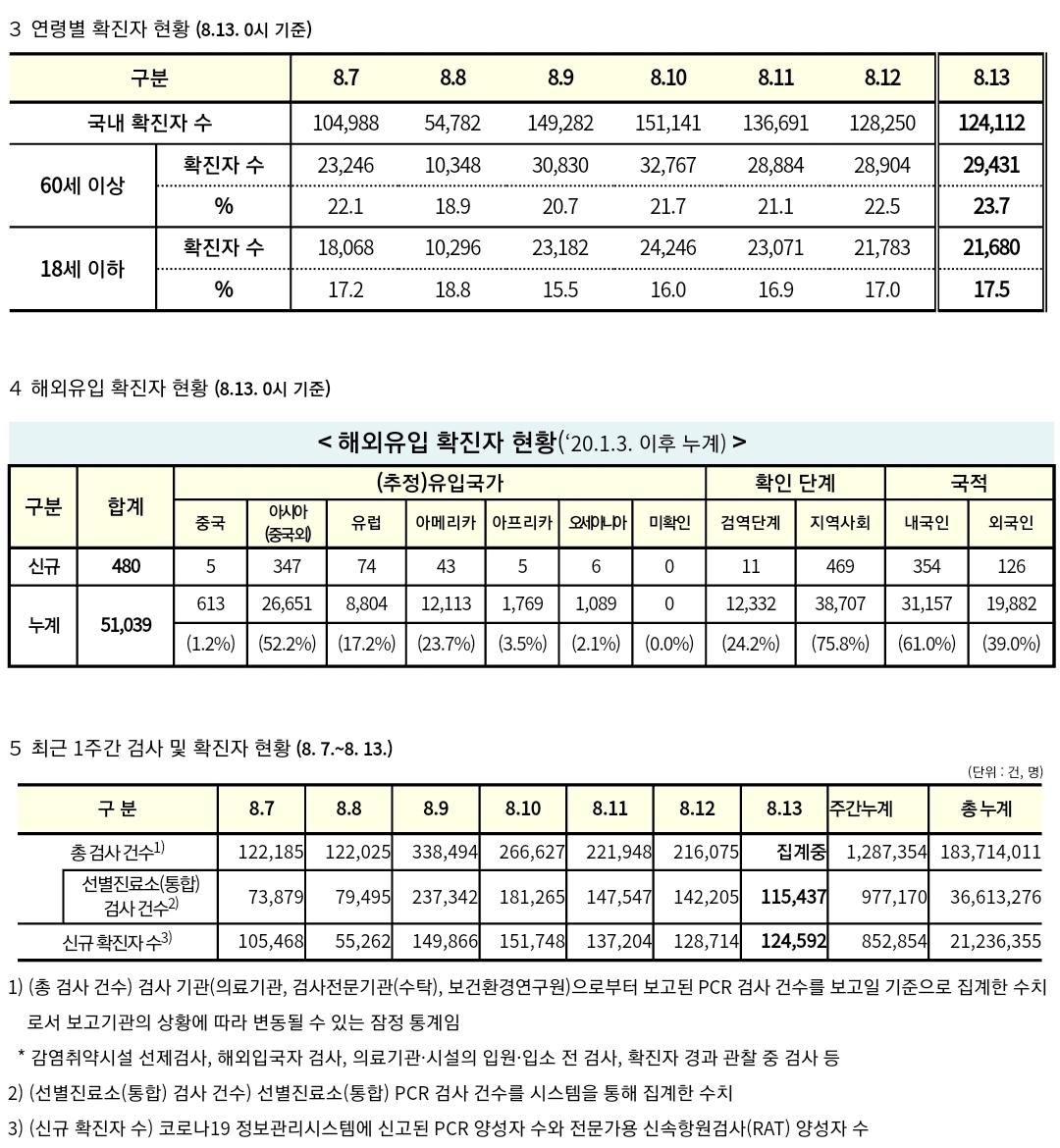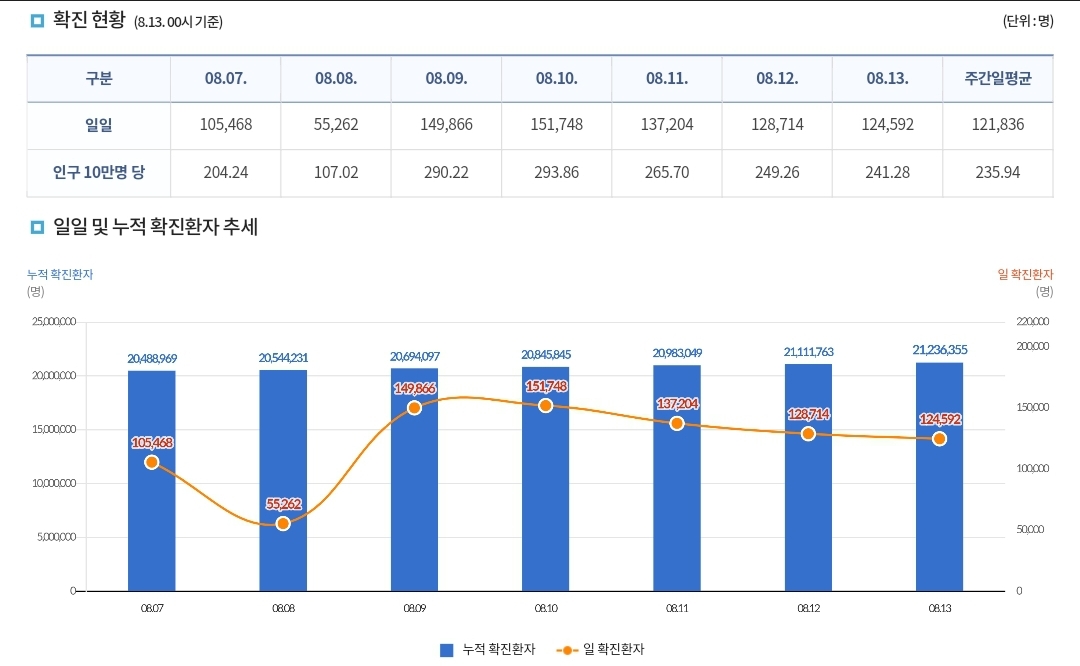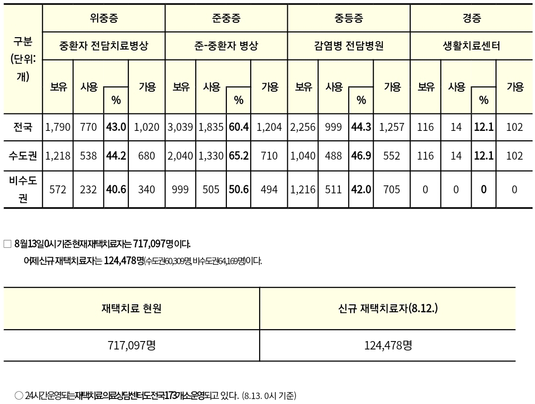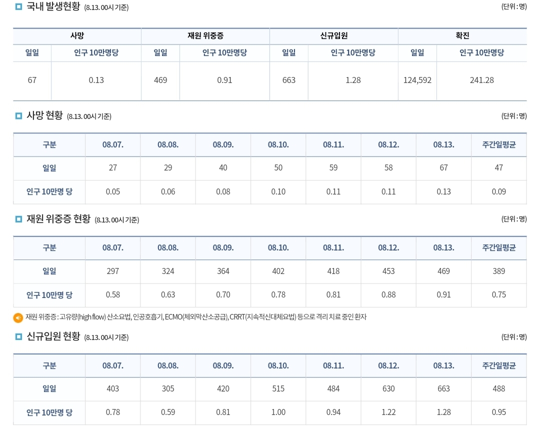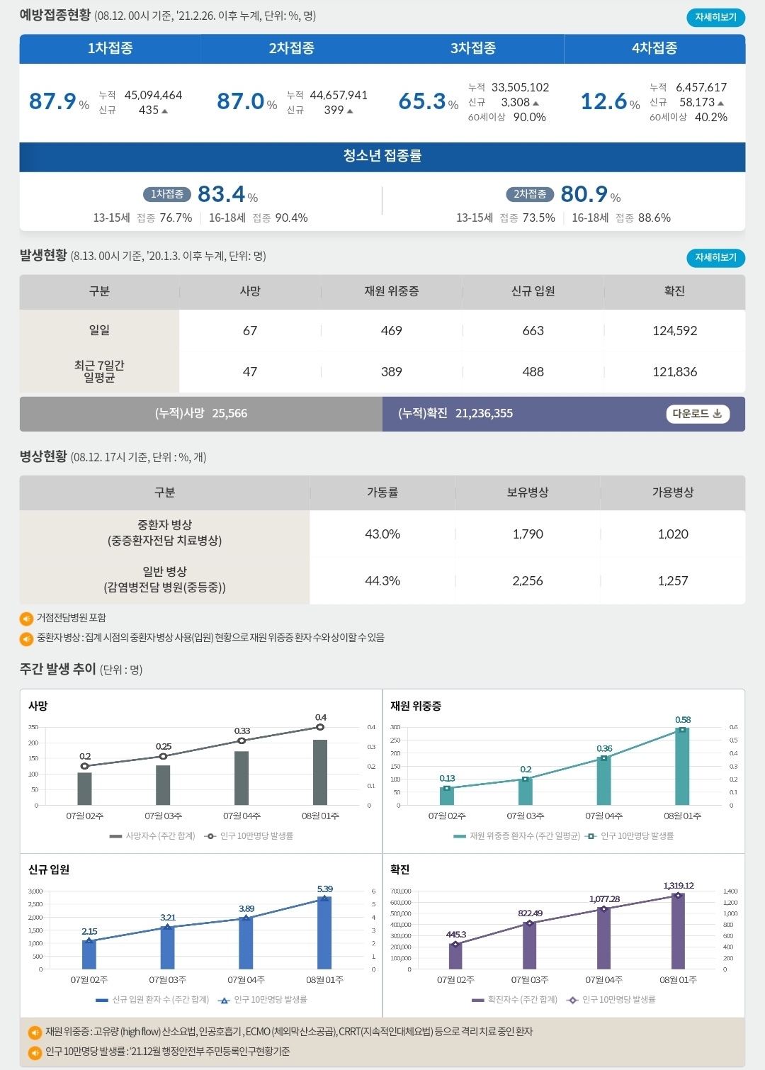코로나19집계(2022.8.13. 0시기준) 확진 +12만, 사망 +67명, 위중증병상가동률 43%, 재택치료 72만 본문