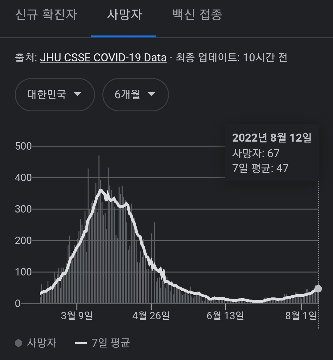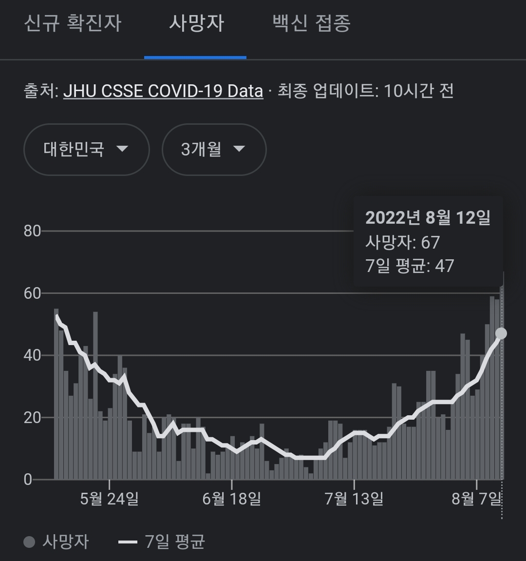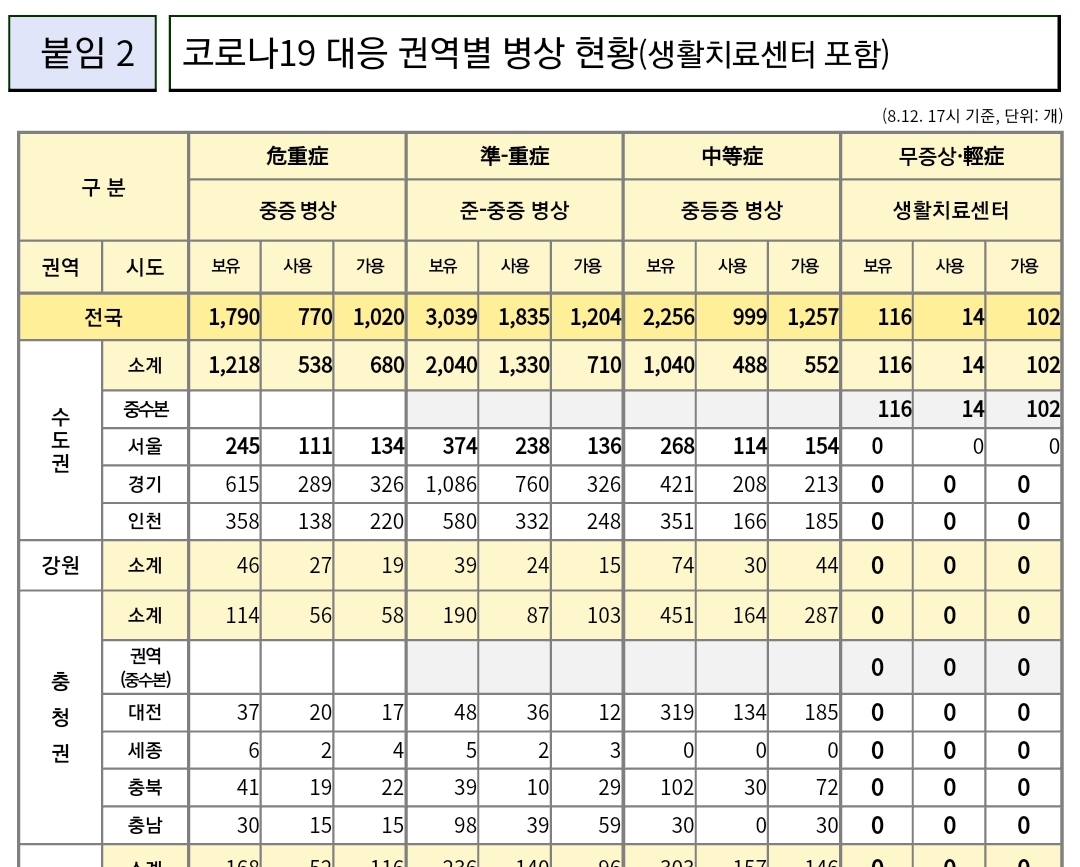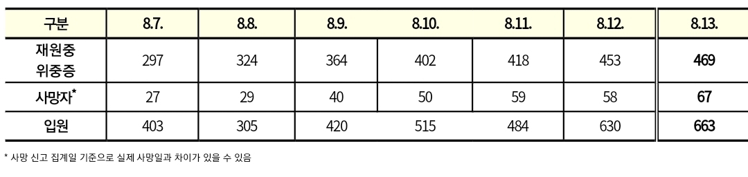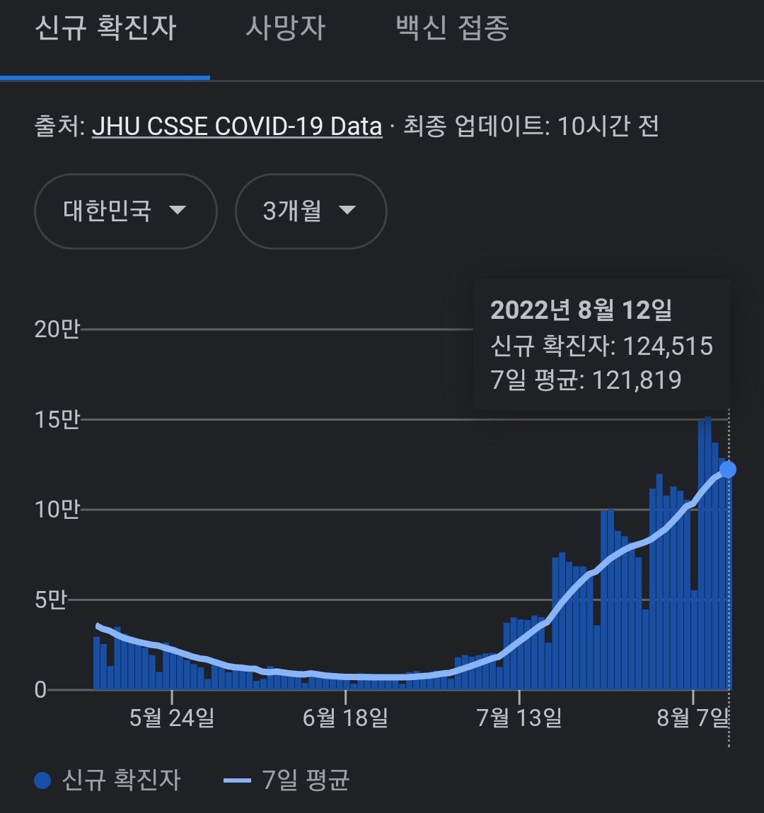 코로나19집계(2022.8.13. 0시기준) 확진 +12만, 사망 +67명, 위중증병상가동률 43%, 재택치료 72만 본문