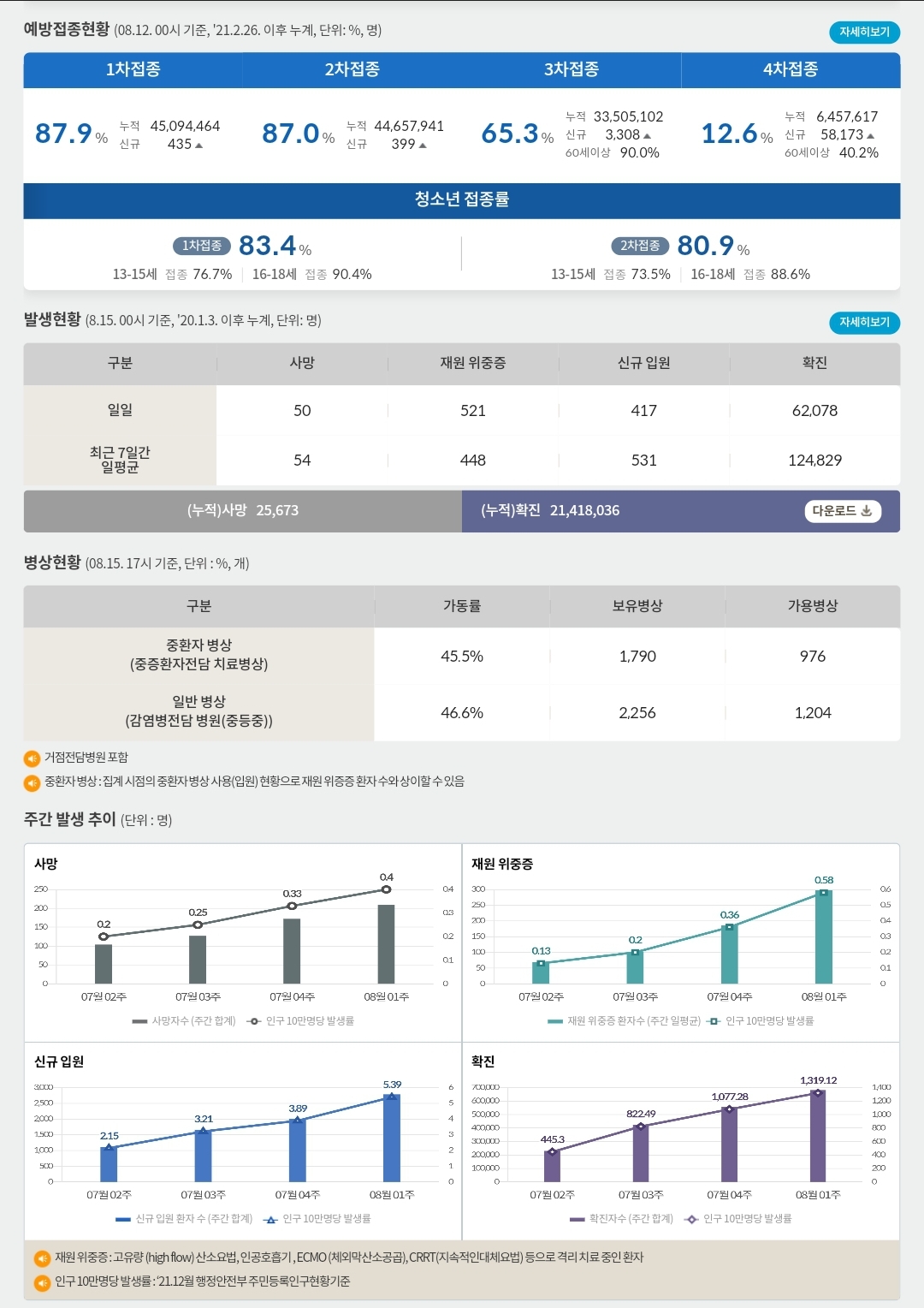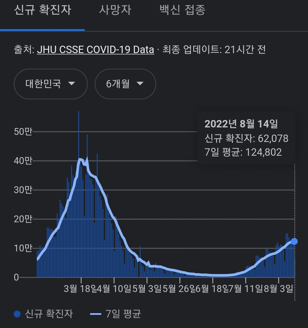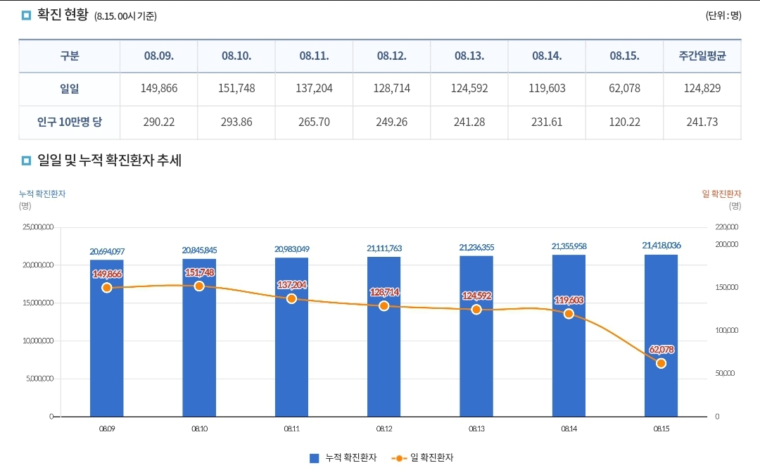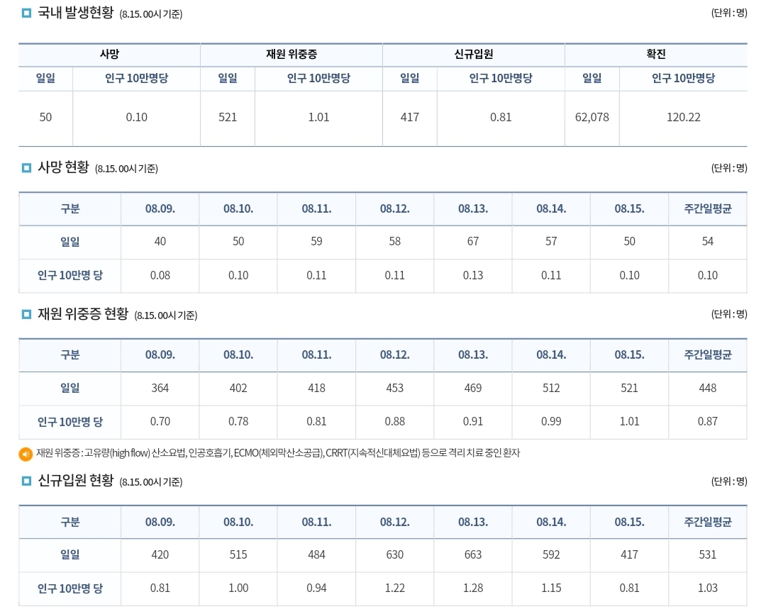 코로나19집계(2022.8.15. 0시기준) 확진 +6.2만, 사망 +50명, 중환자병상가동률 46%, 재택치료 ? 본문