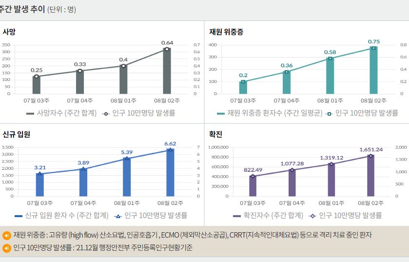 | 코로나19(2022.8.16) 주간 발생 동향 및 위험도 평가 (0) | 2022.08.16 |