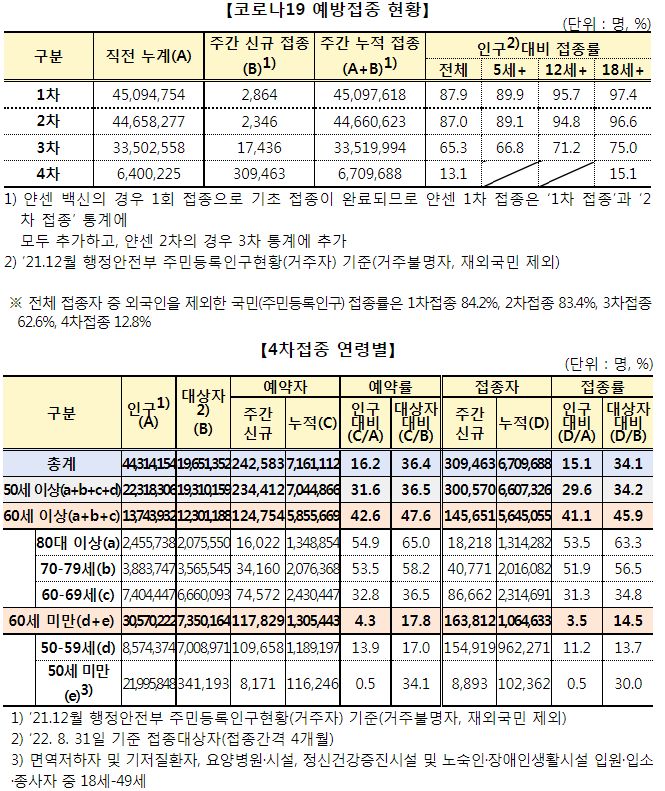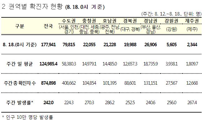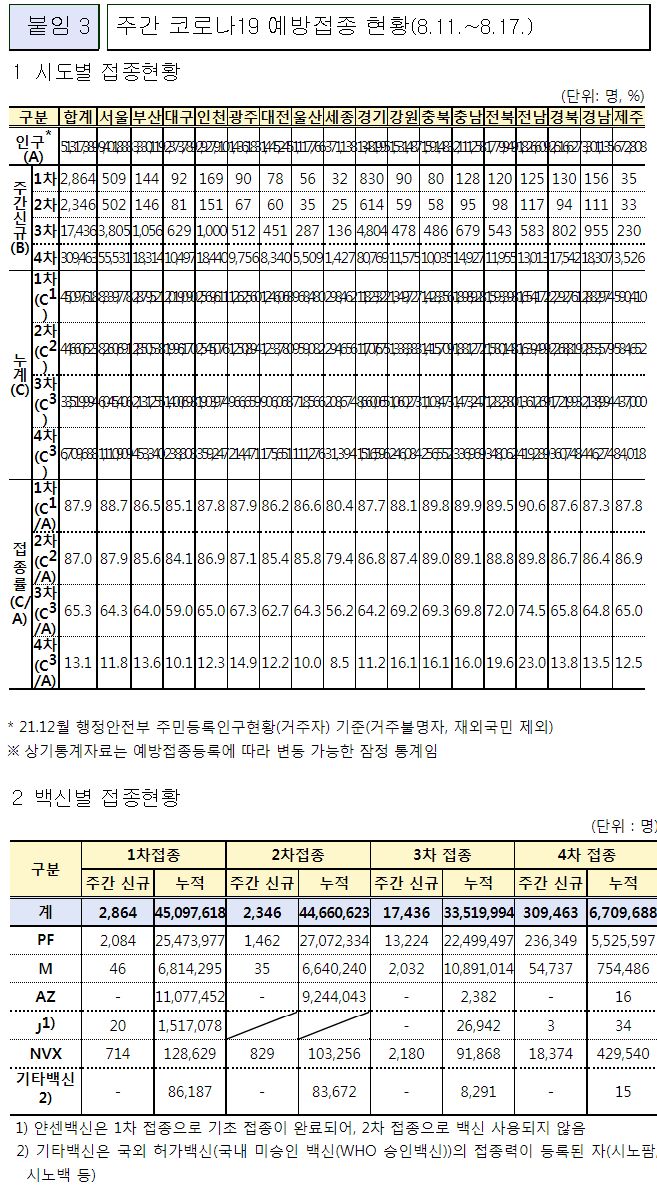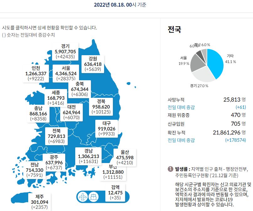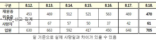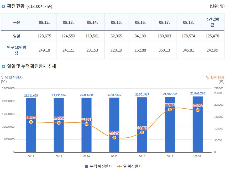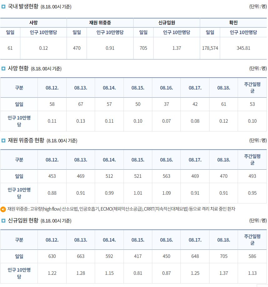 코로나19집계(2022.8.18. 0시기준) 확진 +18만, 사망 +61명, 위중증병상가동률 45%, 재택치료 70만/:/주간 예방접종집계, 이부실드 본문