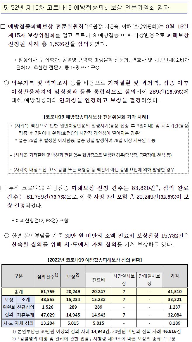 ’22년 제15차 코로나19 예방접종피해보상 전문위원회 결과
