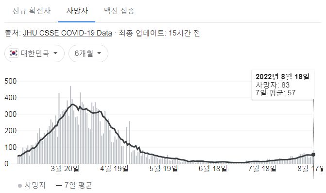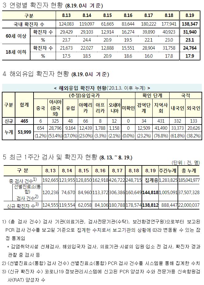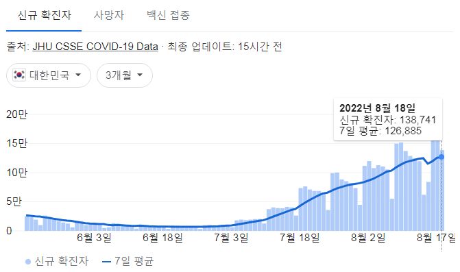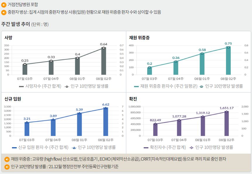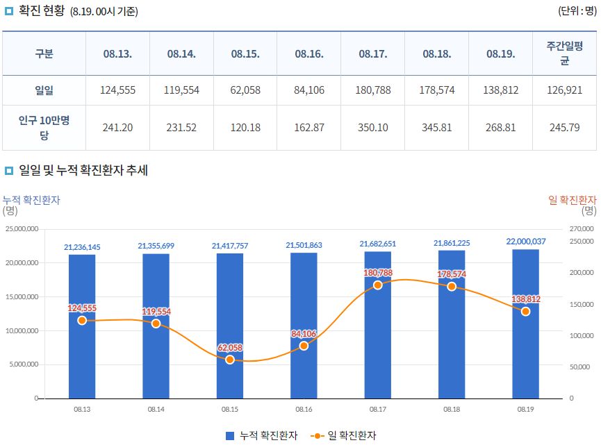 코로나19집계(2022.8.19. 0시기준) 확진 +14만, 사망 +83명★, 중환자병상가동률 45%, 재택치료 73만 본문