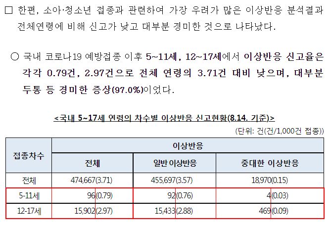 ㅡ 부작용(이상반응)집계에서 소아청소년은 경미하게 나타나므로 예방접종을 권장한다는 말.