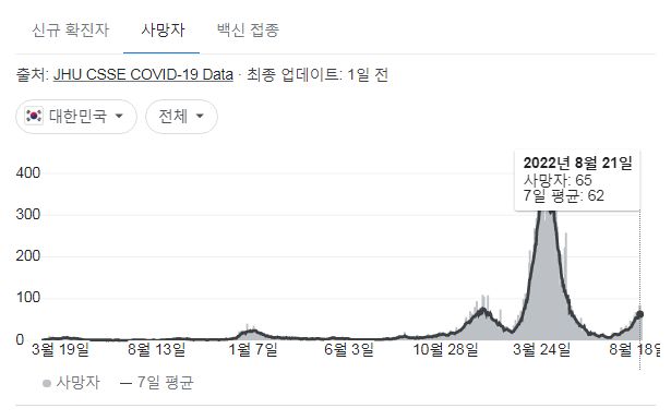 문제는 사망자와 위중증환자의 증가세 패턴일텐데(위중증환자 주간패턴은 화요일 자료로 알 수 있을 겁니다).. 확진자와 마찬가지로 3월달 대유행보다는 훨씬 적지만 더 줄여야겠죠. 그래서 고령층과 기저질환자, 만성호흡기/순환기질환자 등 취약집단에 추가예방접종을 권장하고 있고, 치료제를 더 쓰고 있다고 합니다.