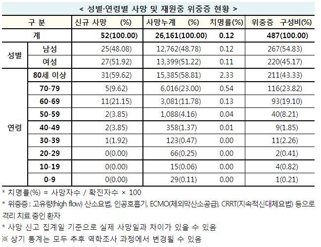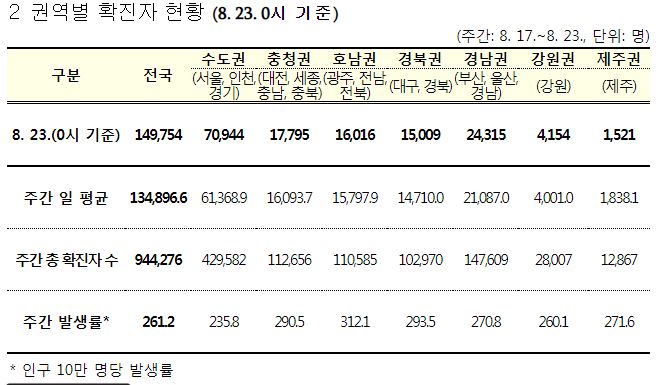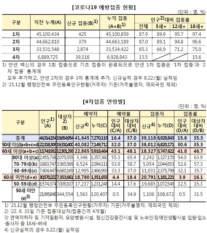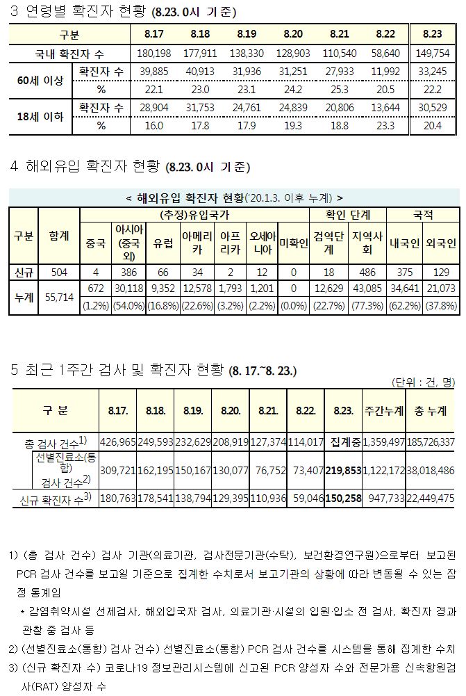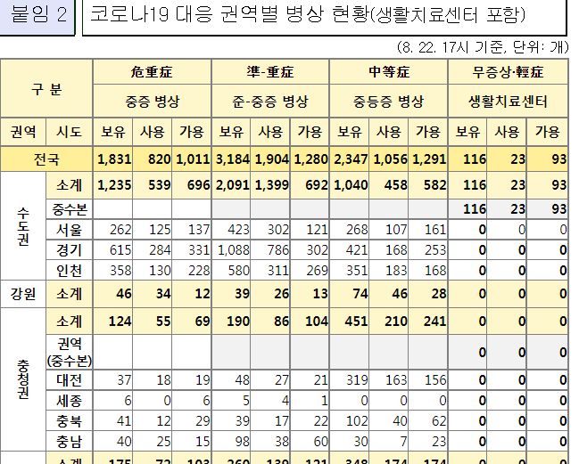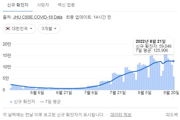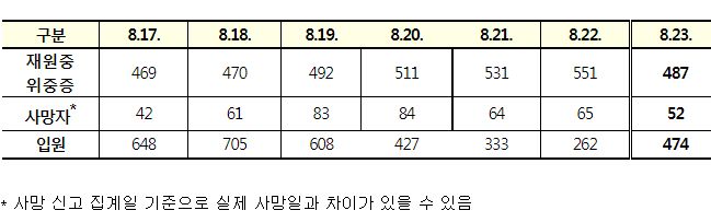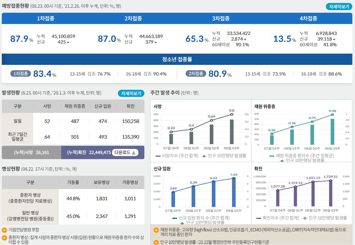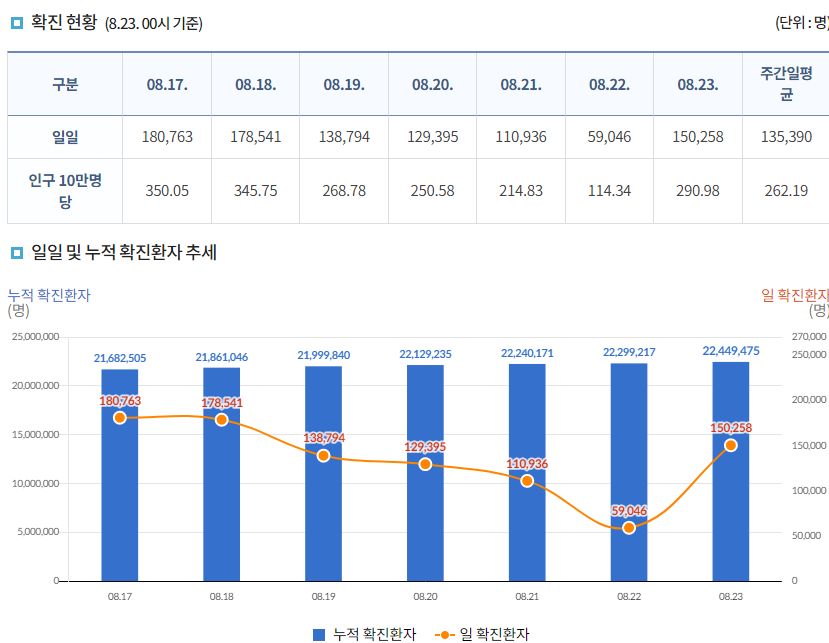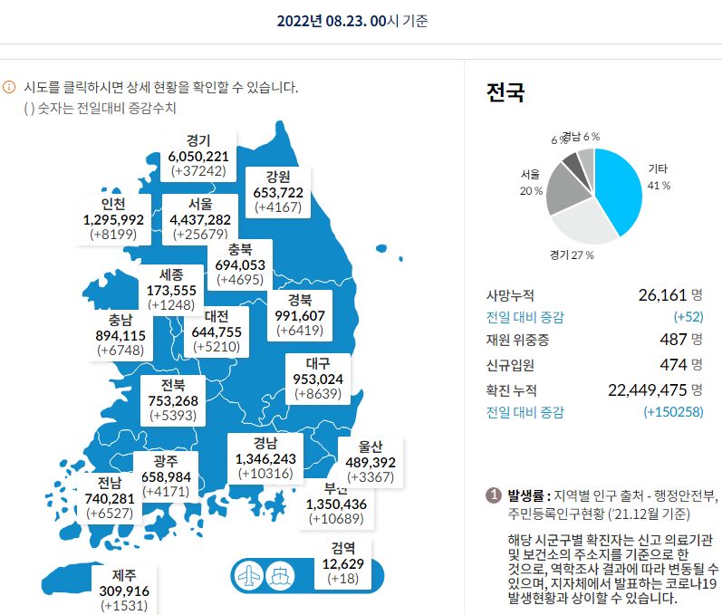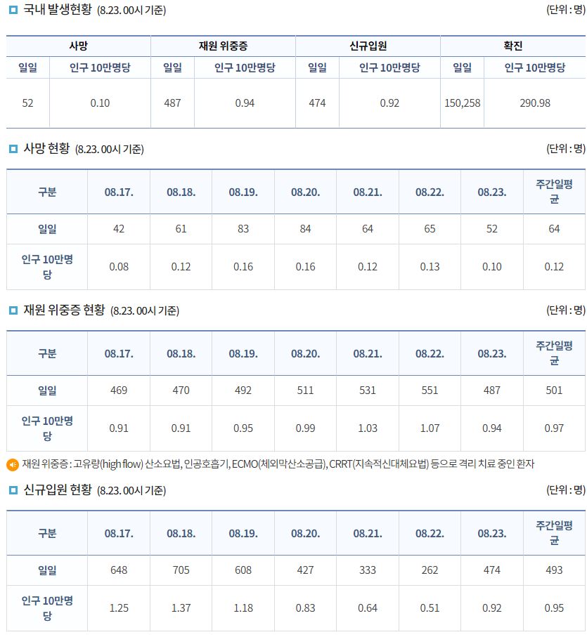 코로나19집계(2022.8.23. 0시기준) 확진 +15만, 사망 +52명, 중환자병상가동률 45%, 재택치료 72만 본문