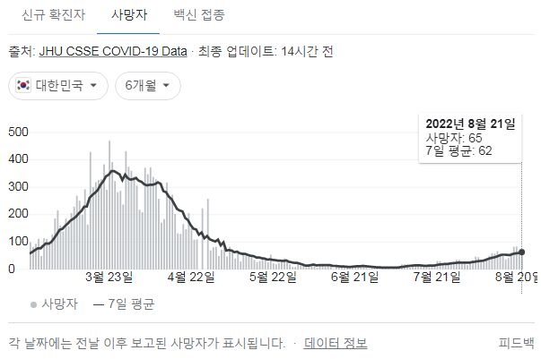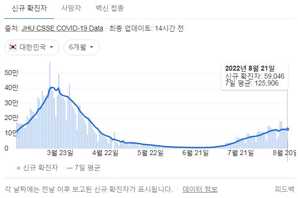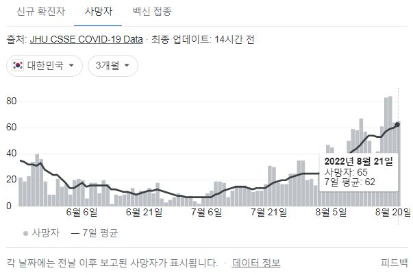 | 코로나19(2022.8.22. 0시기준) 확진 +5.8만, 사망 65명, 위중증병상가동률 47%, 재택치료 75만 (0) | 2022.08.22 |