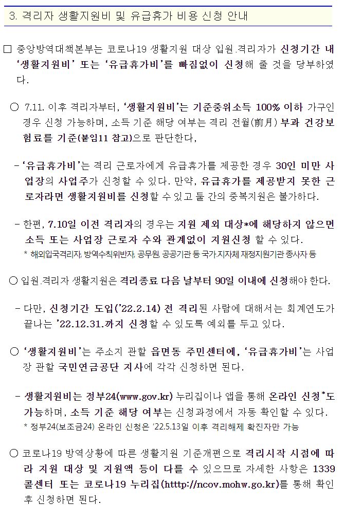 격리자 생활지원비 및 유급휴가 비용 신청 안내