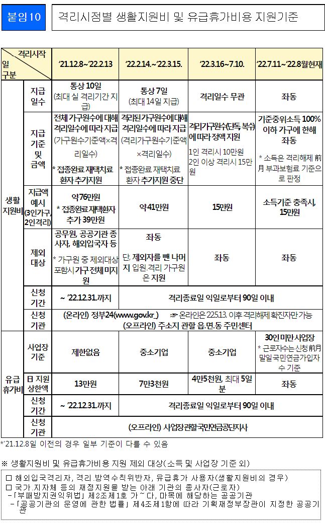 격리시점별 생활지원비 및 유급휴가비용 지원기준