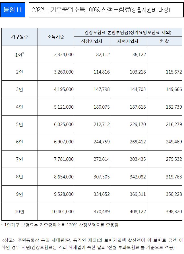 2022년 기준중위소득 100% 산정보험료(생활지원비 대상)