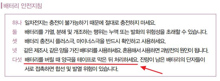 버릴 때는 양극에 테이프를 붙이라는 부분. 아하..