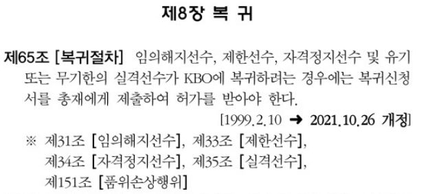 프로야구선수는 은퇴(물론, 징계나 다른 불미스런 이유가 있는 은퇴가 아니라, 방출이나 합의에 의한 선수계약종료같은 것. 구단에서 은퇴식을 열어준 경우 포함) 후 복귀가 안 되나하는 생각이 들어서 조금 찾아봤는데, 결론부터 적으면, 알아내지 못했다.1