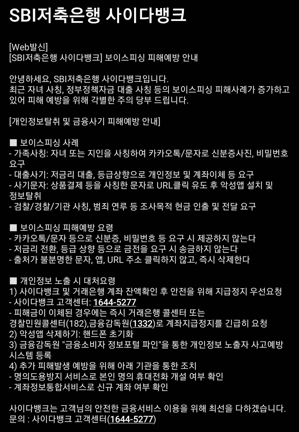 지인이나 기관을 사칭한 개인정보, 계좌정보, 신분증사본 요구 주의(사이다뱅크 안내) 본문