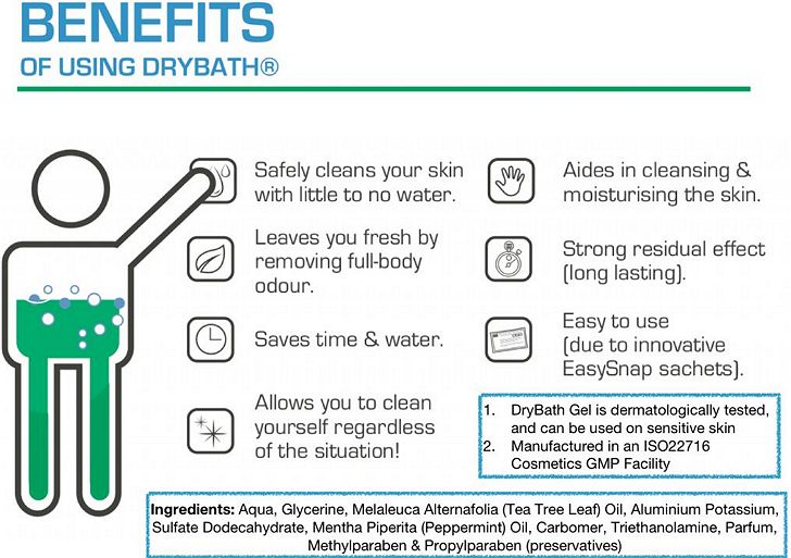 드라이배스(DryBath): 물로 샤워하는 대신 닦아서 신체청결하는 1회용 겔 본문