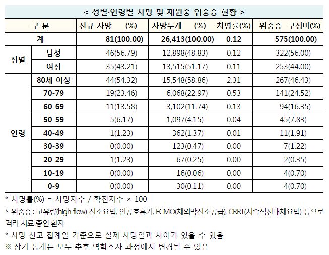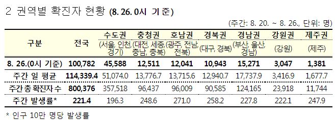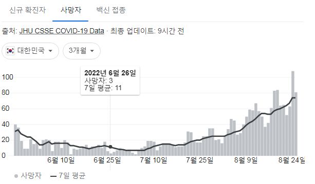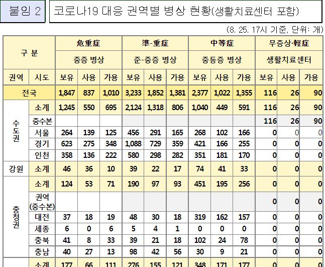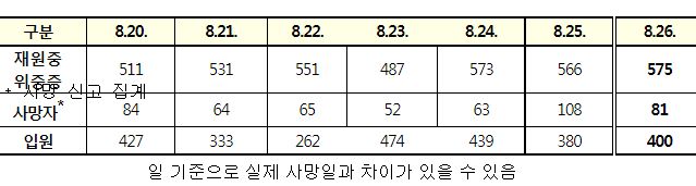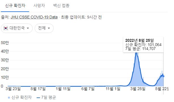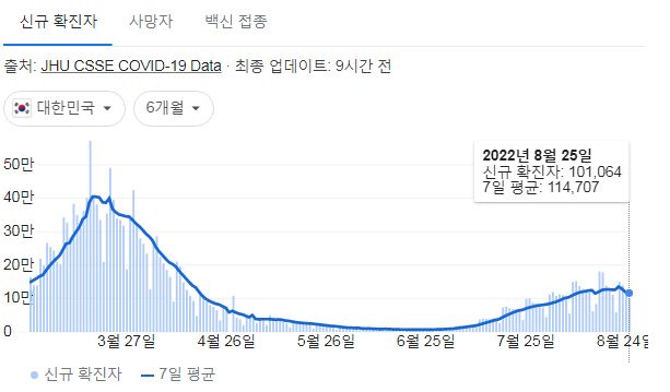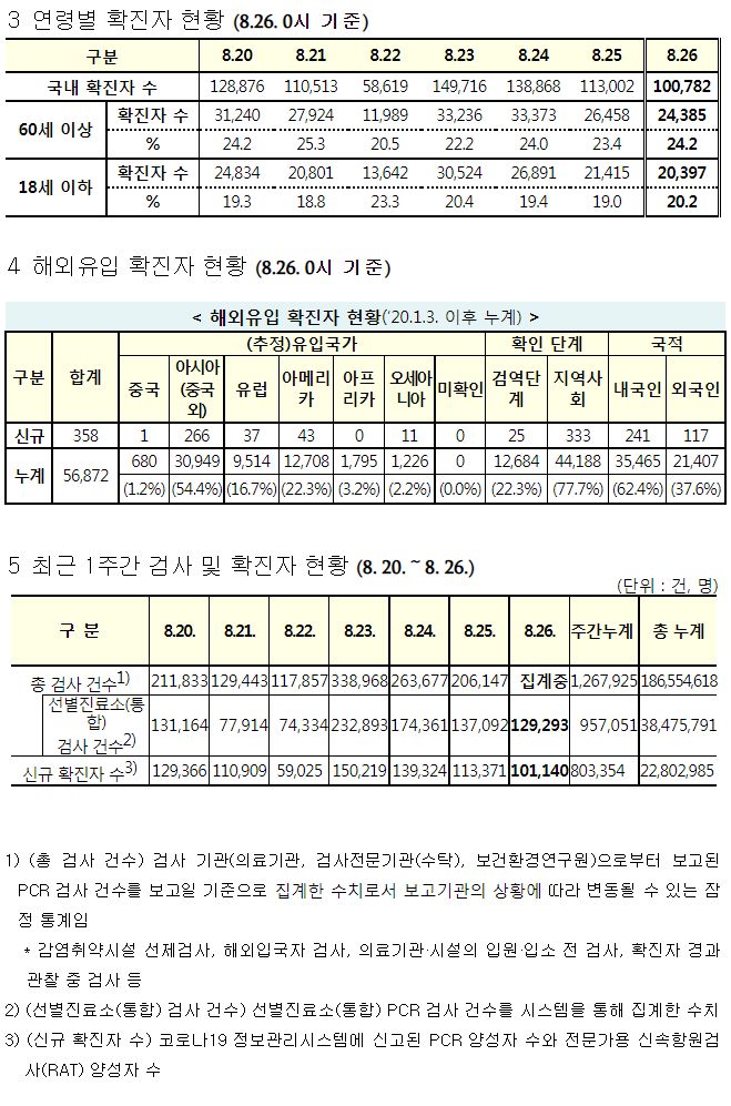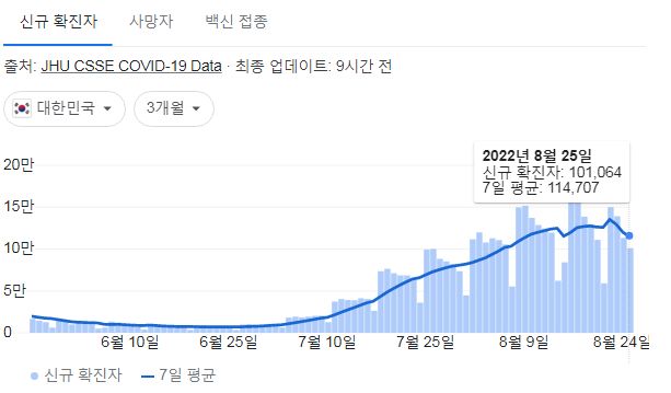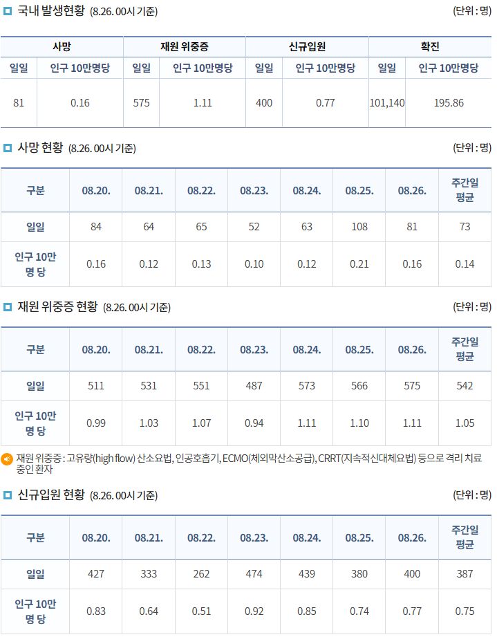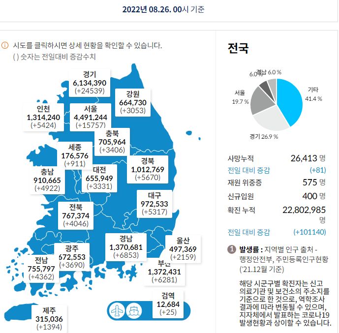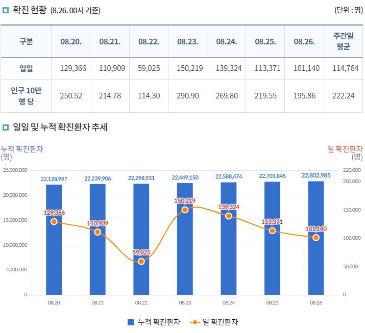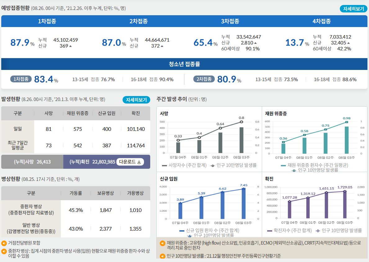 코로나19집계(2022.8.26. 0시기준) 확진 +10만, 사망 +81명, 중환자병상가동률 45%, 재택치료 65만 본문