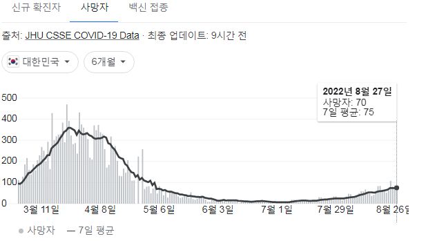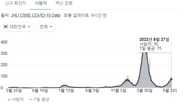 일일사망자수는 이전 유행때도 그랬듯이 한동안 늘었다가 줄어들 것 같네요.