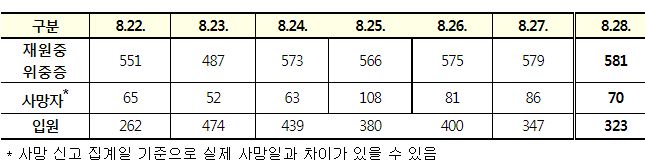 위중중환자수도 8월 1일에는 300명이 안 됐고, 8월 10일에는 400명을 넘었고, 8월 20일에는 500명을 넘었습니다. 오늘 581명이니까, 위중증환자수와 일일사망자수가 줄어들려면 시간이 지나야 할 것 같습니다.