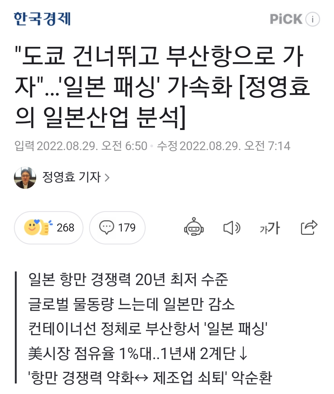 (컨테이너?) 일본발 미국향 화물이 감소하는 추세(......) 2022년 상반기 일본-미국 물류에서 직항은 6할로 감소했고 4할은 환적. 환적수요 대부분은 한국과 싱가포르가 처리(......) "일본의 항만 경쟁력은 버블(거품)경제 붕괴 이후 일본 제조업이 쇠퇴하면서 오랜 기간 떨어져 왔다. 하지만 코로나19 이후 해운산업의 '일본 패싱'이 가속화하면서 제조업의 지위도 한층 낮아지는 악순환에 빠지고 있다"는 불안