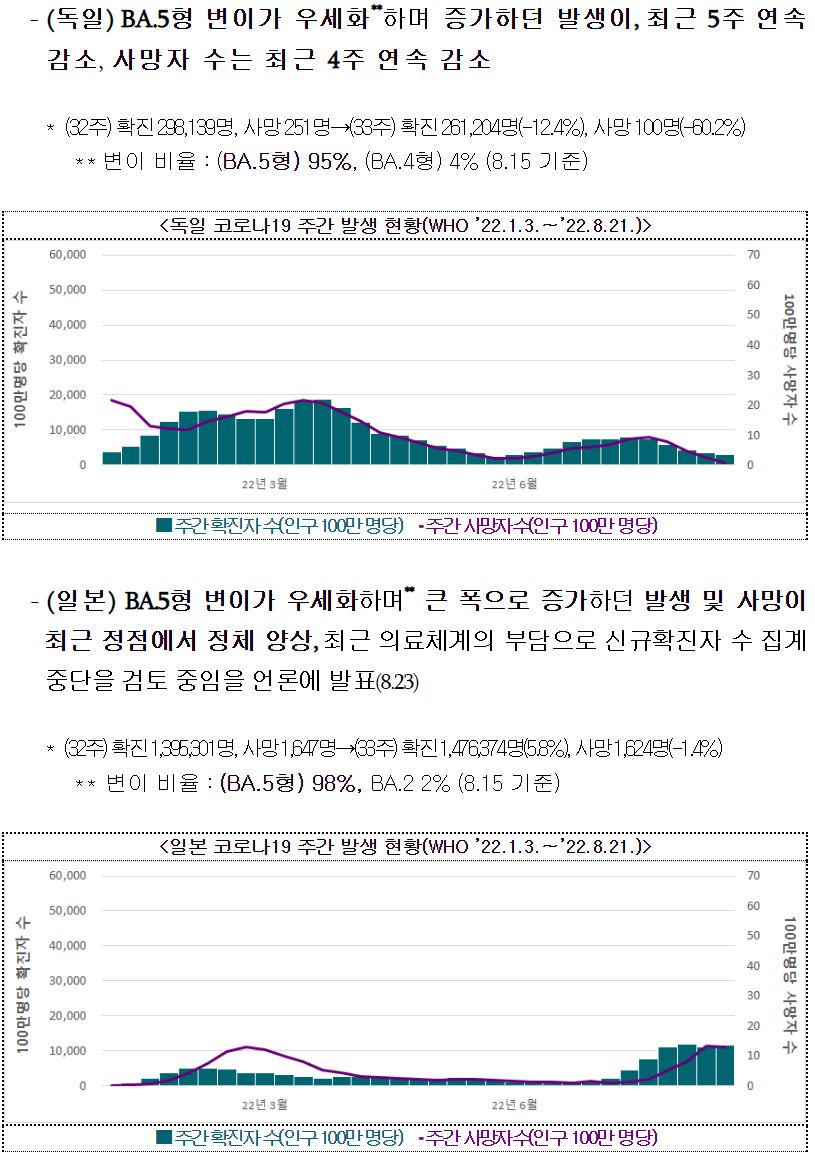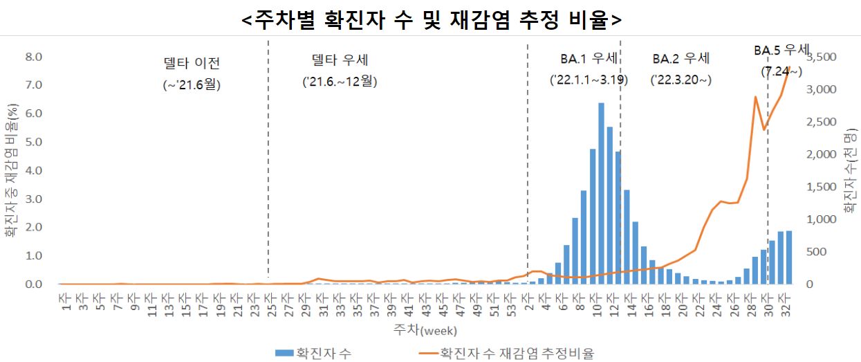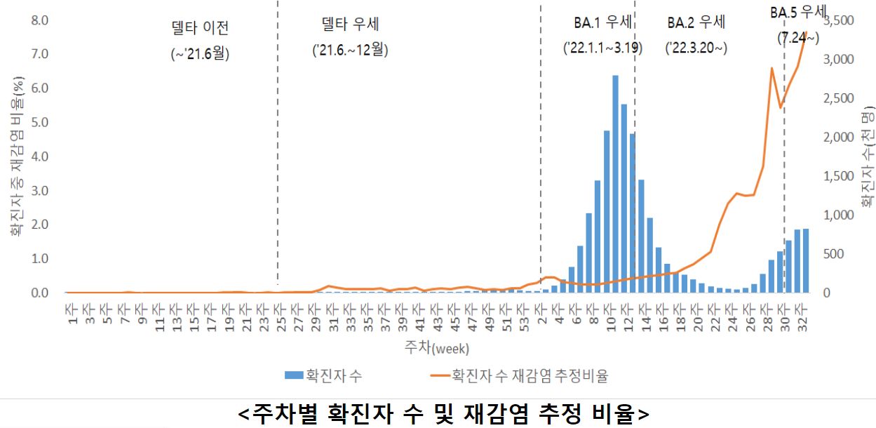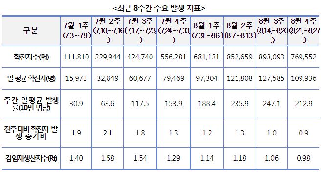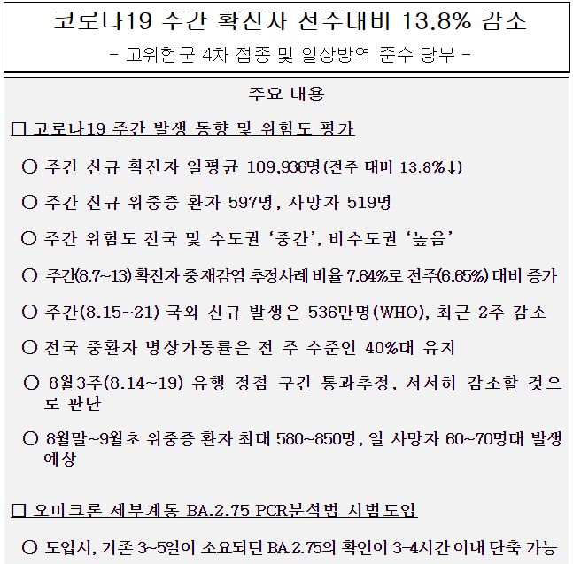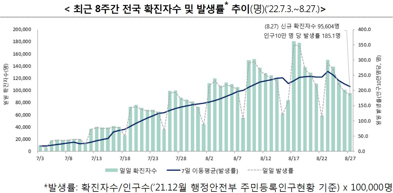코로나19(2022.8.30) 주간 발생 동향 및 위험도 평가: 감염재생산지수 0.98 본문