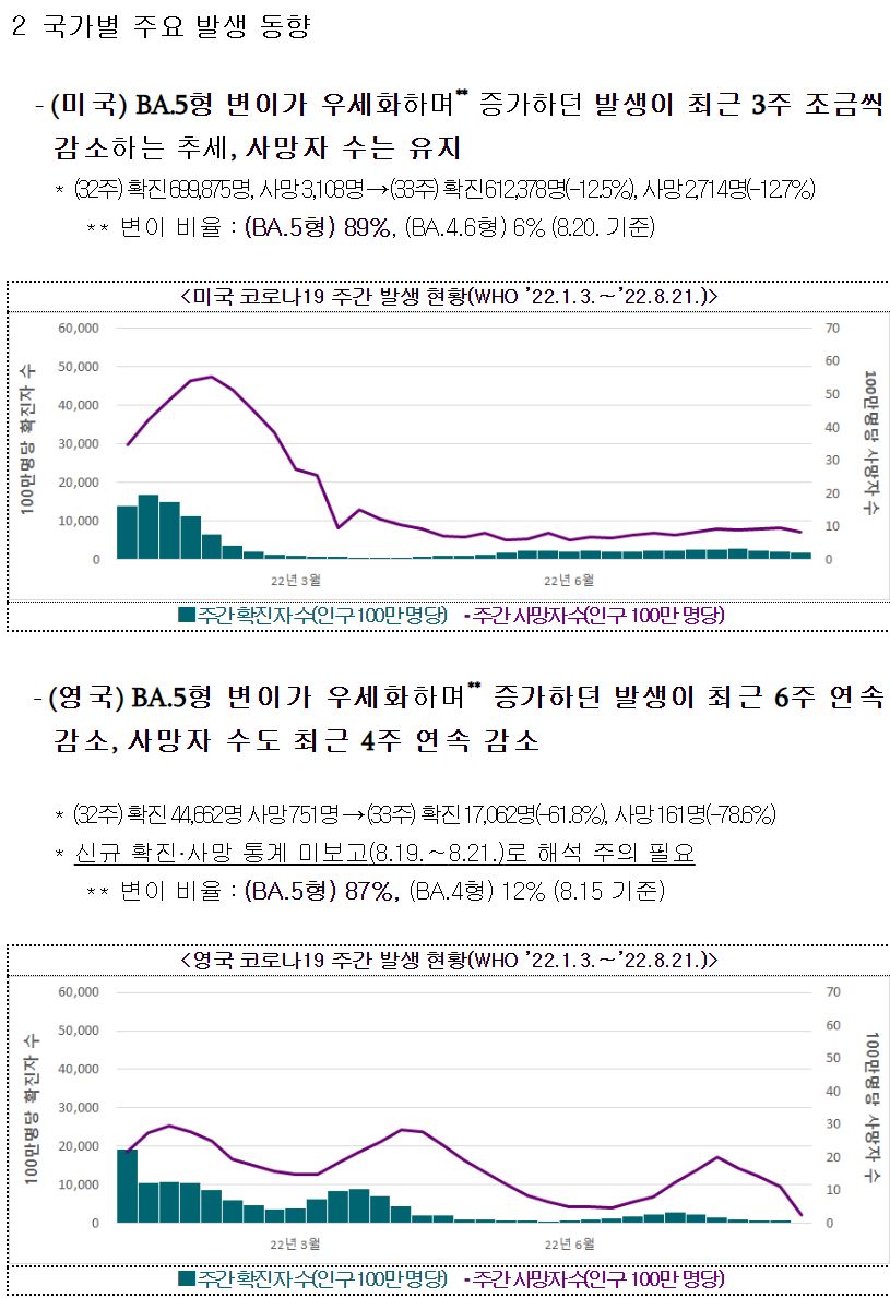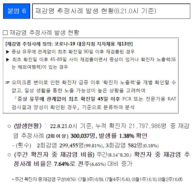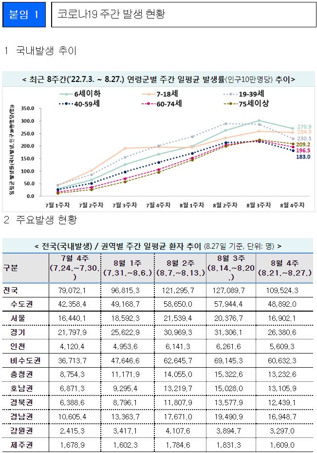 코로나19(2022.8.30) 주간 발생 동향 및 위험도 평가: 감염재생산지수 0.98 본문