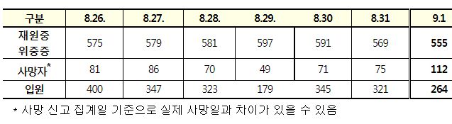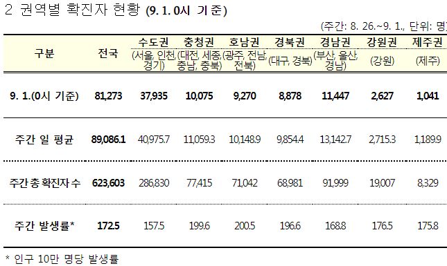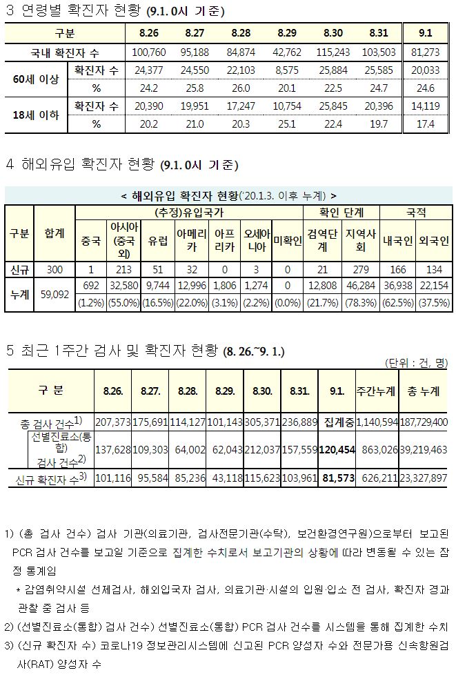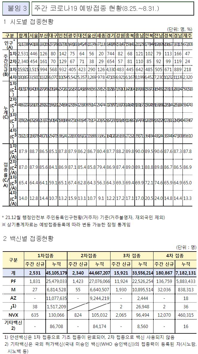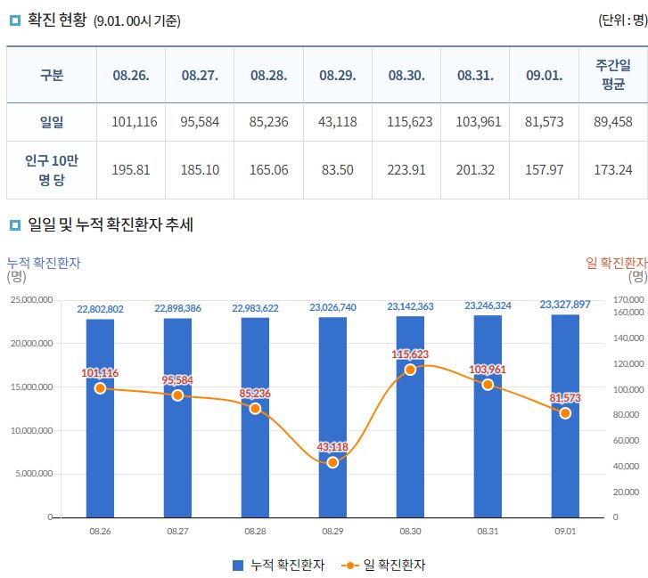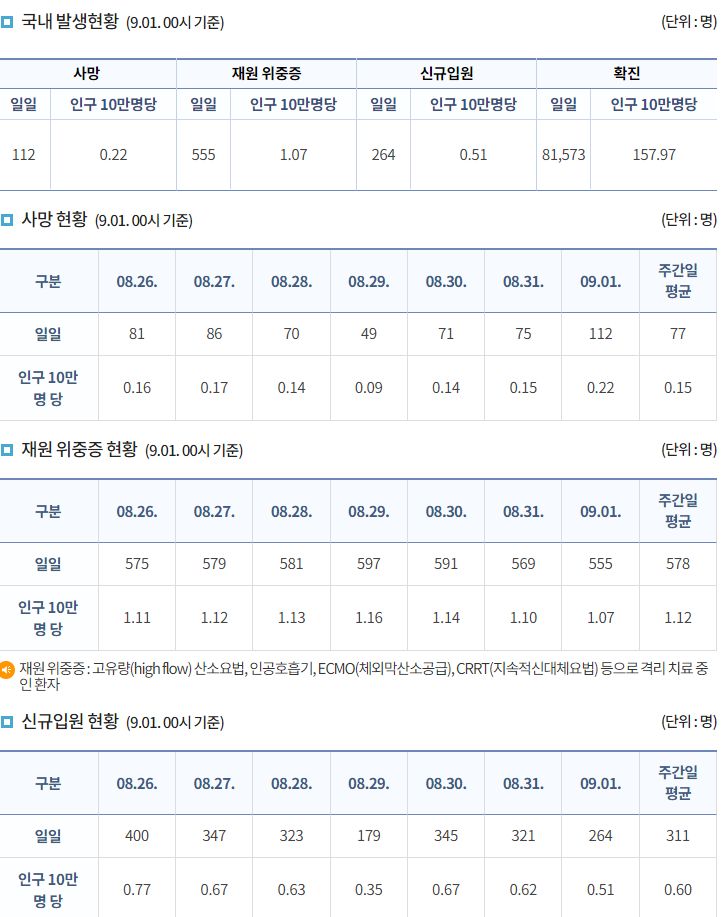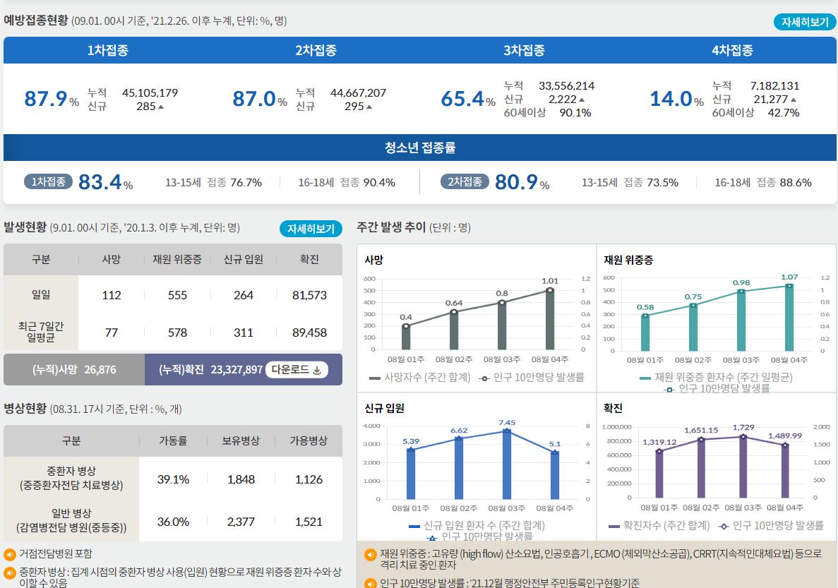 코로나19집계(2022.9.1. 0시기준): 확진 +8.9만, 사망 +112명★, 중환자병상가동률 39%, 재택치료 51만/:/ 주간 예방접종률 본문