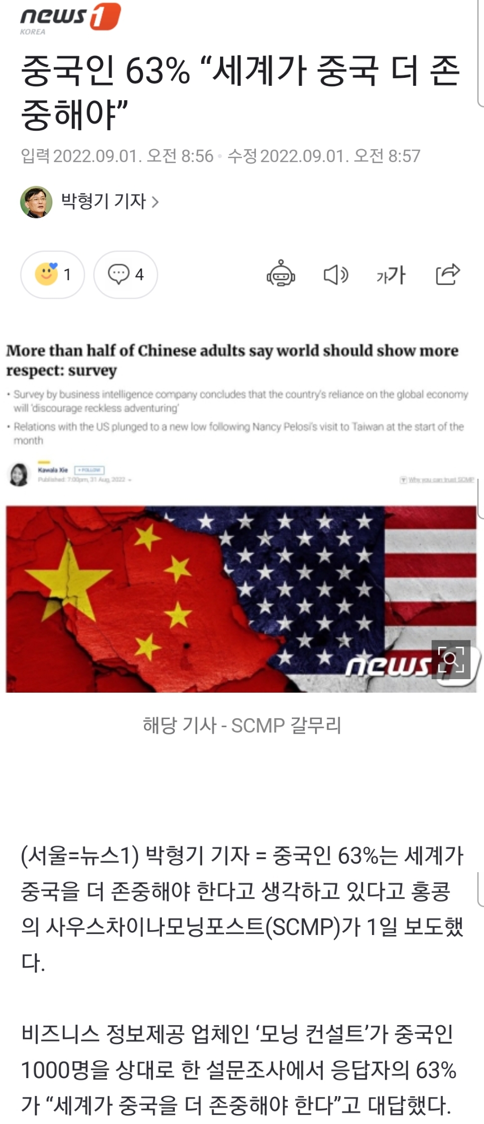 중국인 63%는 세계가 중국을 더 존중해야 한다고 생각하고 있다고 홍콩의 사우스차이나모닝포스트(SCMP)가 1일 보도했다. 비즈니스 정보제공 업체인 ‘모닝 컨설트’가 중국인 1000명을 상대로 한