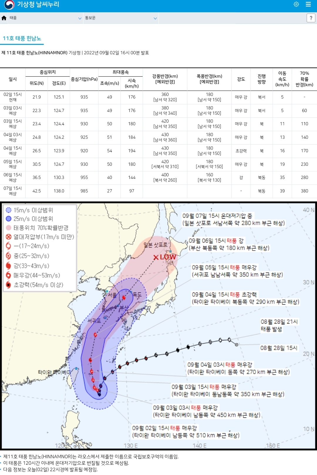 (2022.9.2.16시기준) 제 11호 태풍 힌남노(HINNAMNOR): 부산 통과 본문