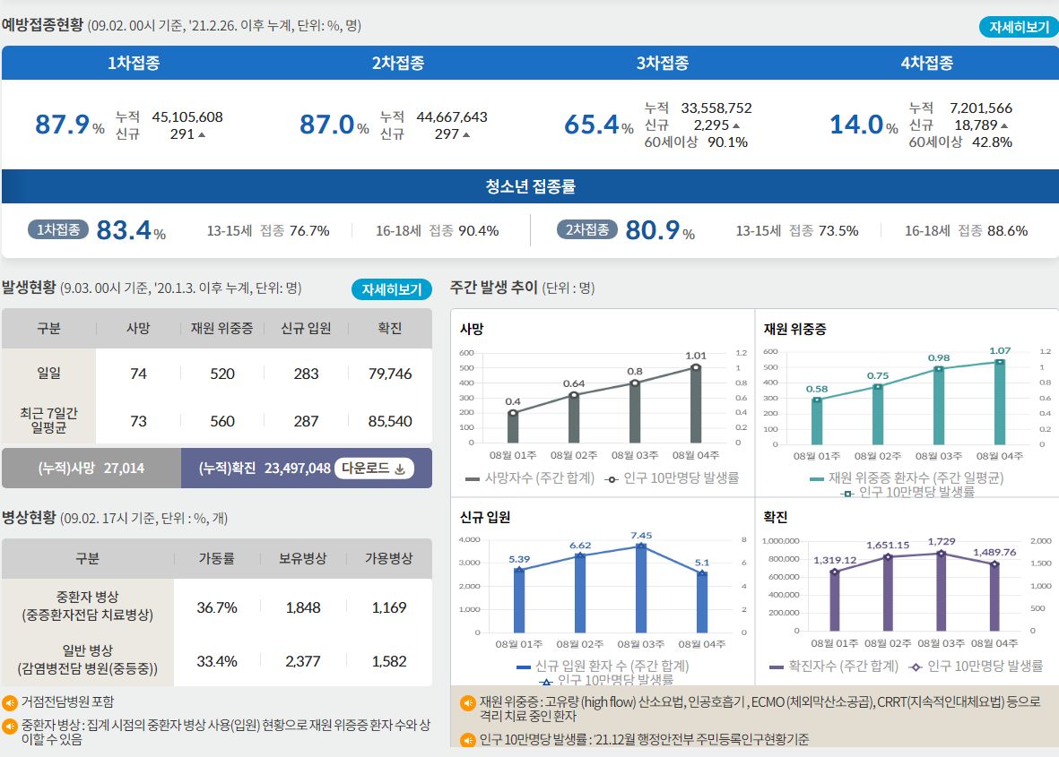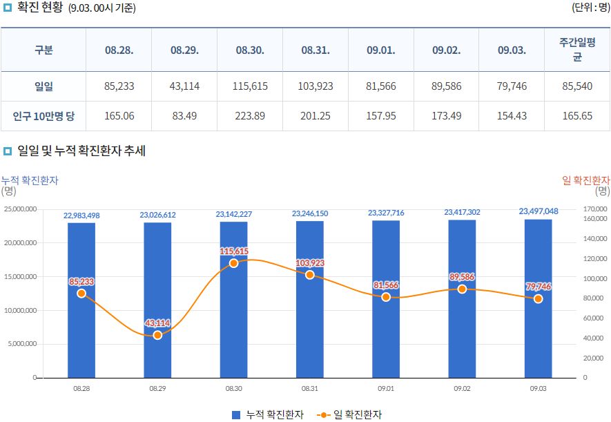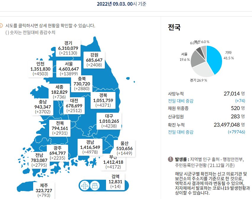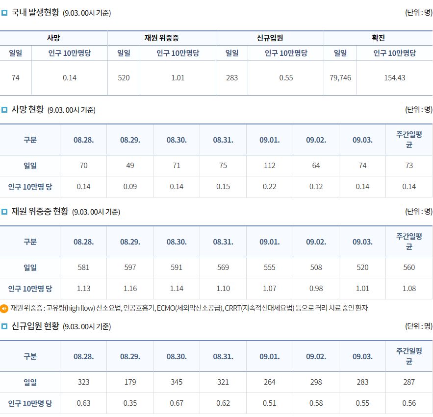 코로나19집계(2022.9.3. 0시기준) 확진 +8.0만, 사망 +74명, 중환자병상가동률 37%, 재택치료 ? 본문