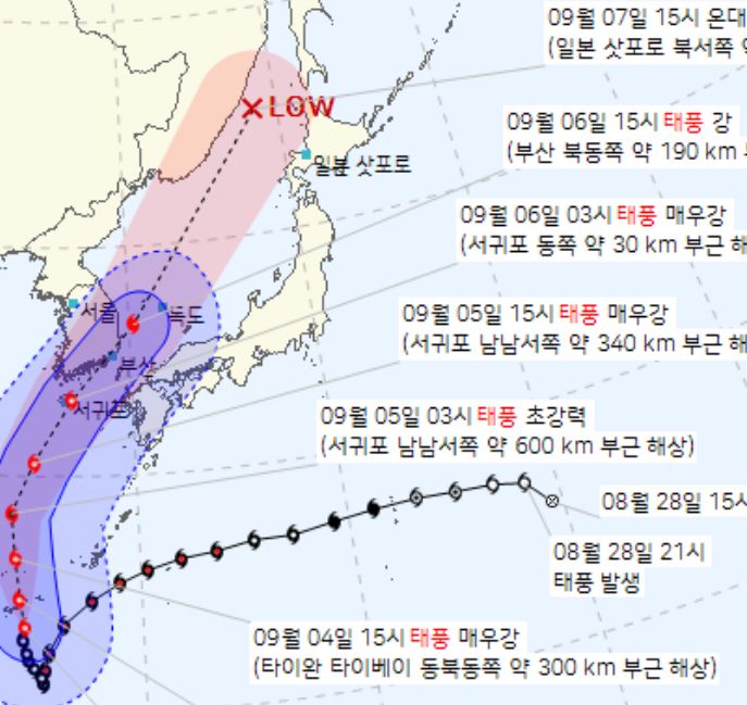 한반도에 상륙한다는 예보입니다. 최근 예보에 따르면, 이번 태풍은 9월 6일 화요일 오전에 경남 남해안에 상륙해서 경남 동부해안으로 빠져나갑니다. 옛날 무척 큰 피해를 준 모 태풍과 같은 경로, 더 세거나 비슷한 세기가 될 것이라는데.. 한반도 제주도와 경남 남해안에 들어올 때는 "매우강"(최대풍속 45m/s, 중심기압 945 hPa).