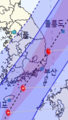 제주도를 지나도 "매우강" 등급 예상. 1시 예보때는 경남해안 상륙전후에 하나 내려가 "강"등급이 될 것이라고 했습니다.