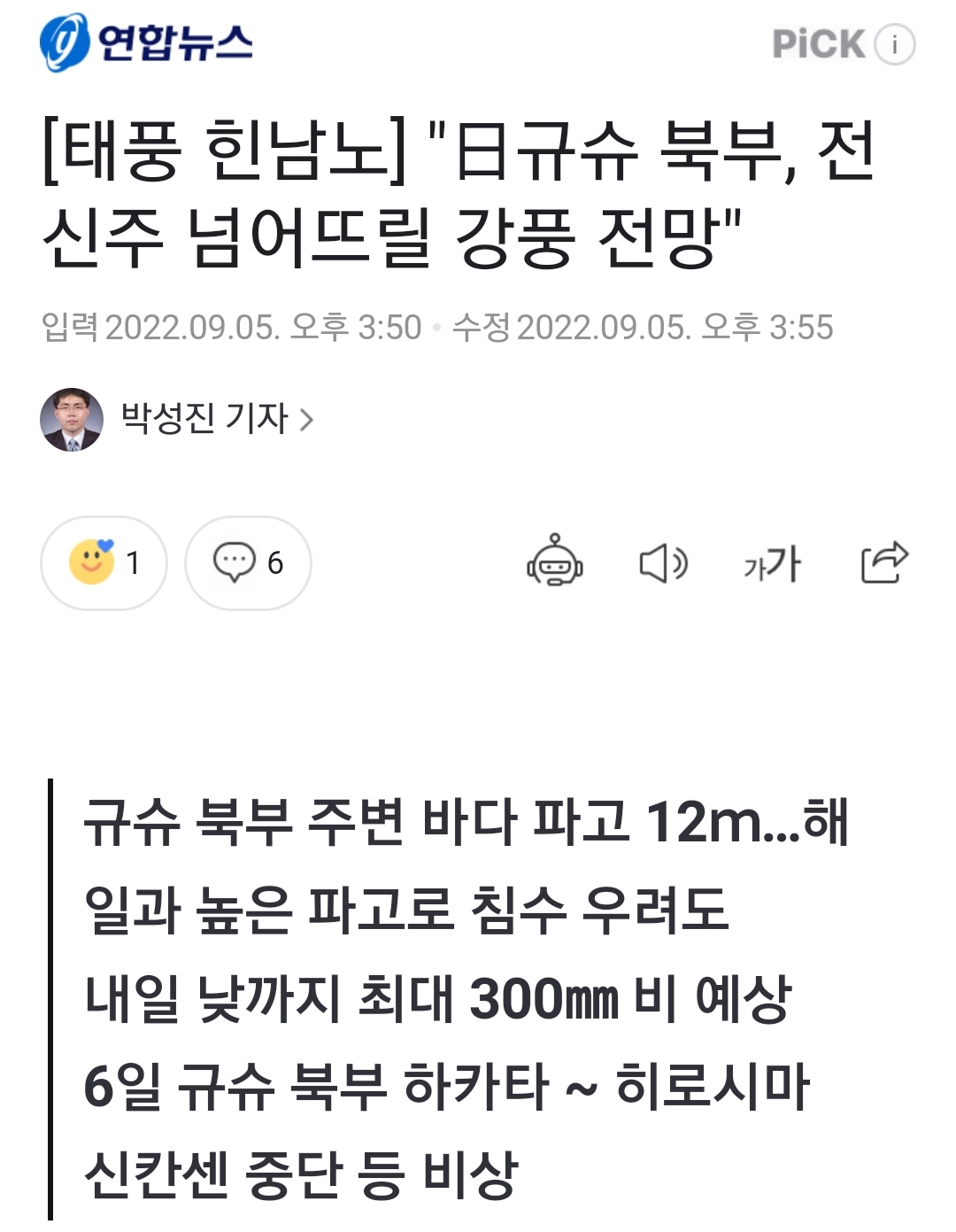 규슈 북부 주변 바다 파고 12m…해일과 높은 파고로 침수 우려도내일 낮까지 최대 300㎜ 비 예상6일 규슈 북부 하카타 ~ 히로시마 신칸센 중단 등 비상오키나와 나하시 중심부에서 강풍에 부러진