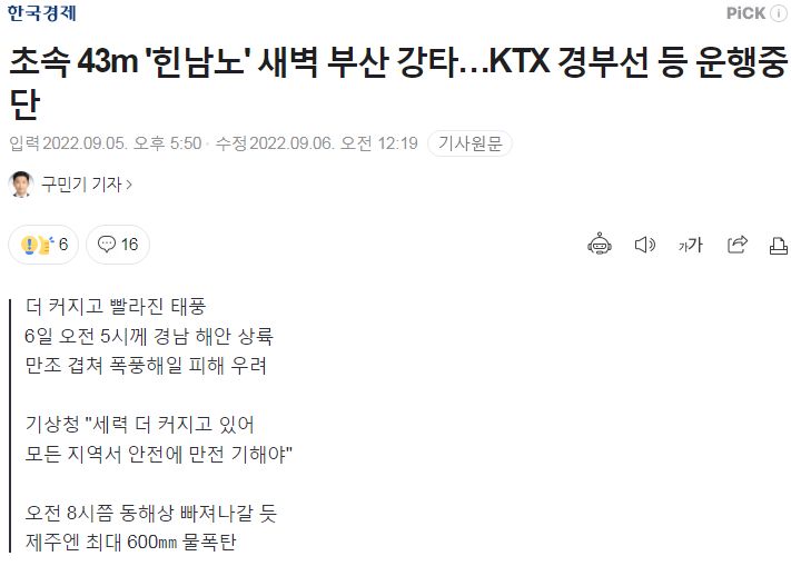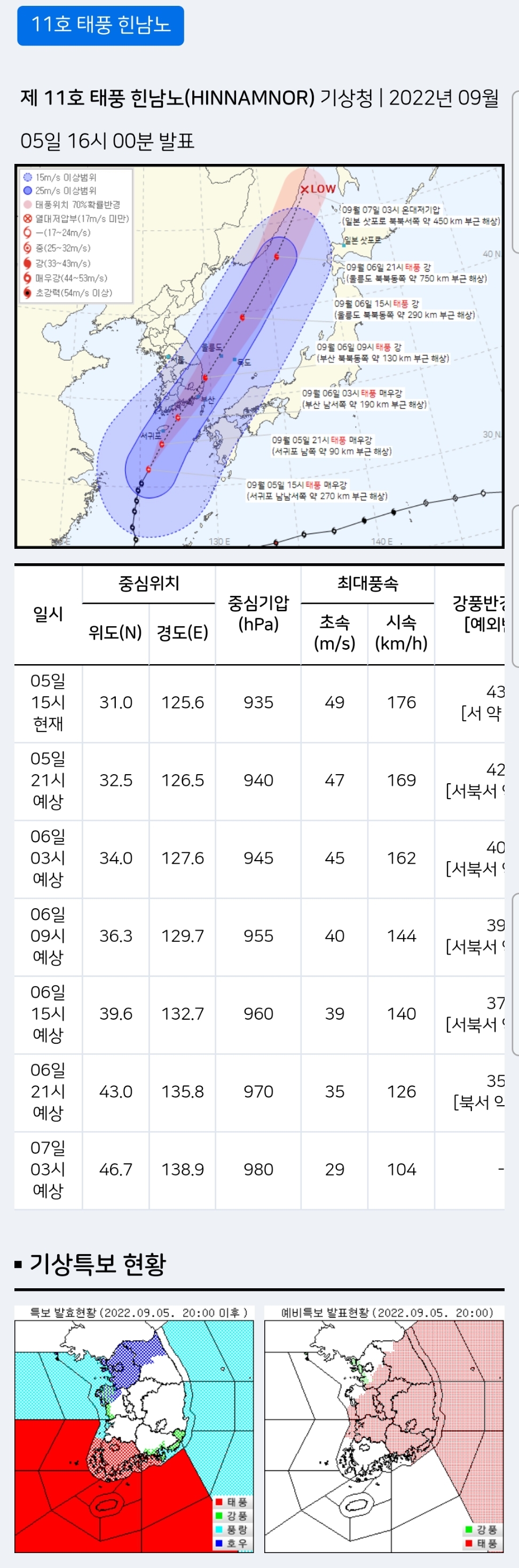 (2022.9.5. 16시) 제 11호 태풍 힌남노(HINNAMNOR) - 기상청 발표 본문