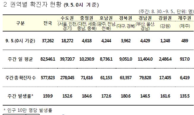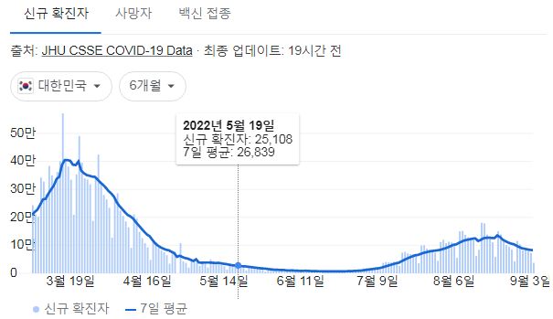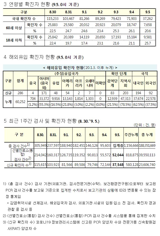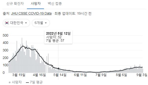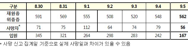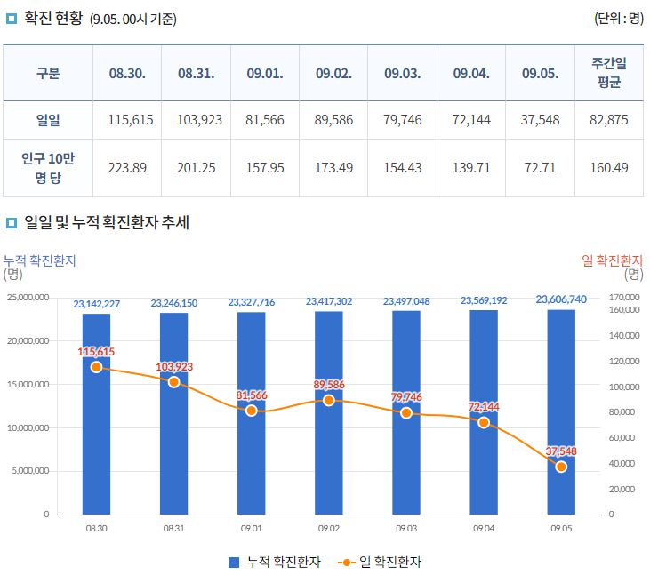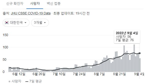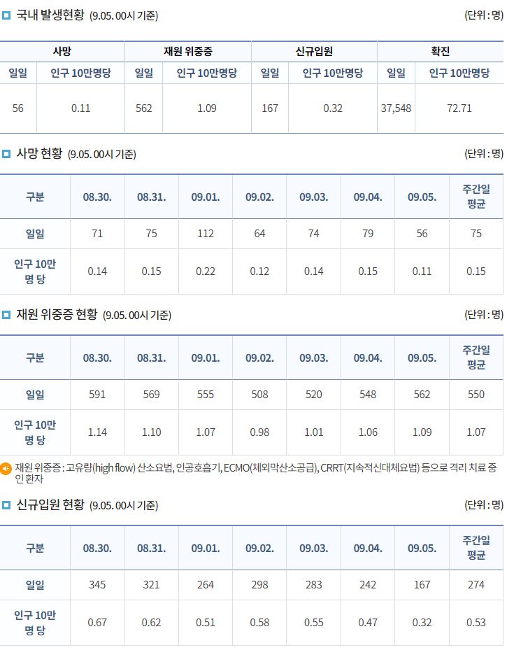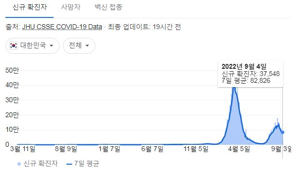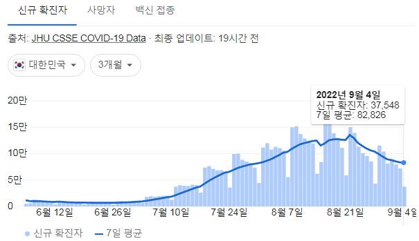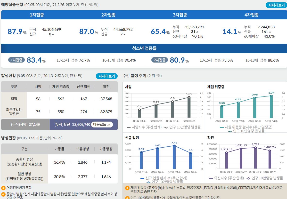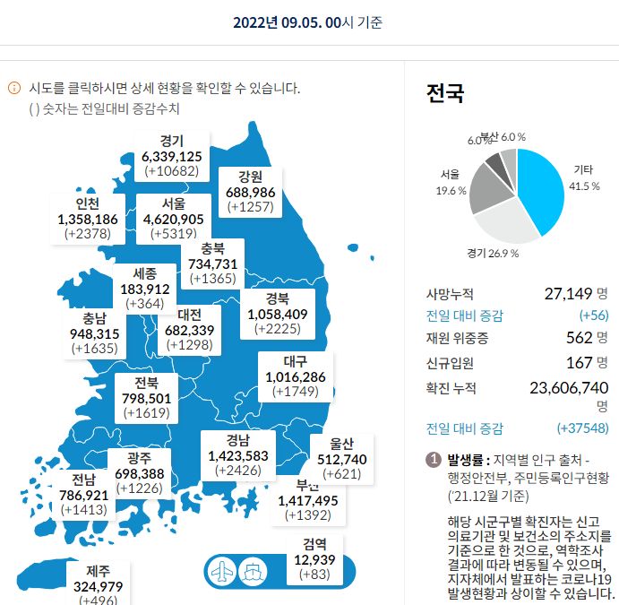 코로나19집계(2022.9.5. 0시기준) 확진 +3.8만, 사망 +56명, 중환자병상가동률 36%, 재택치료 47만 본문