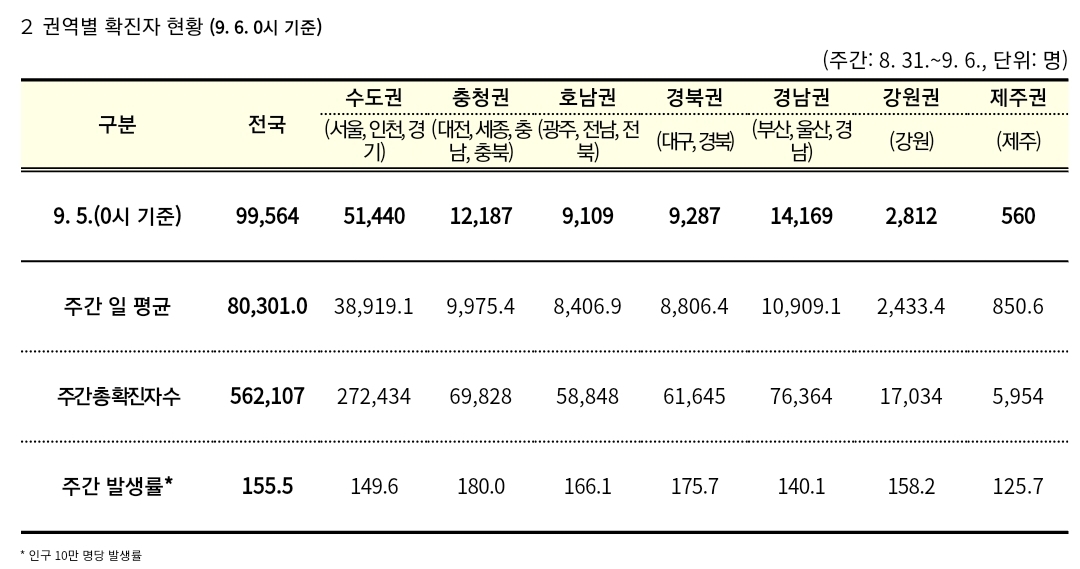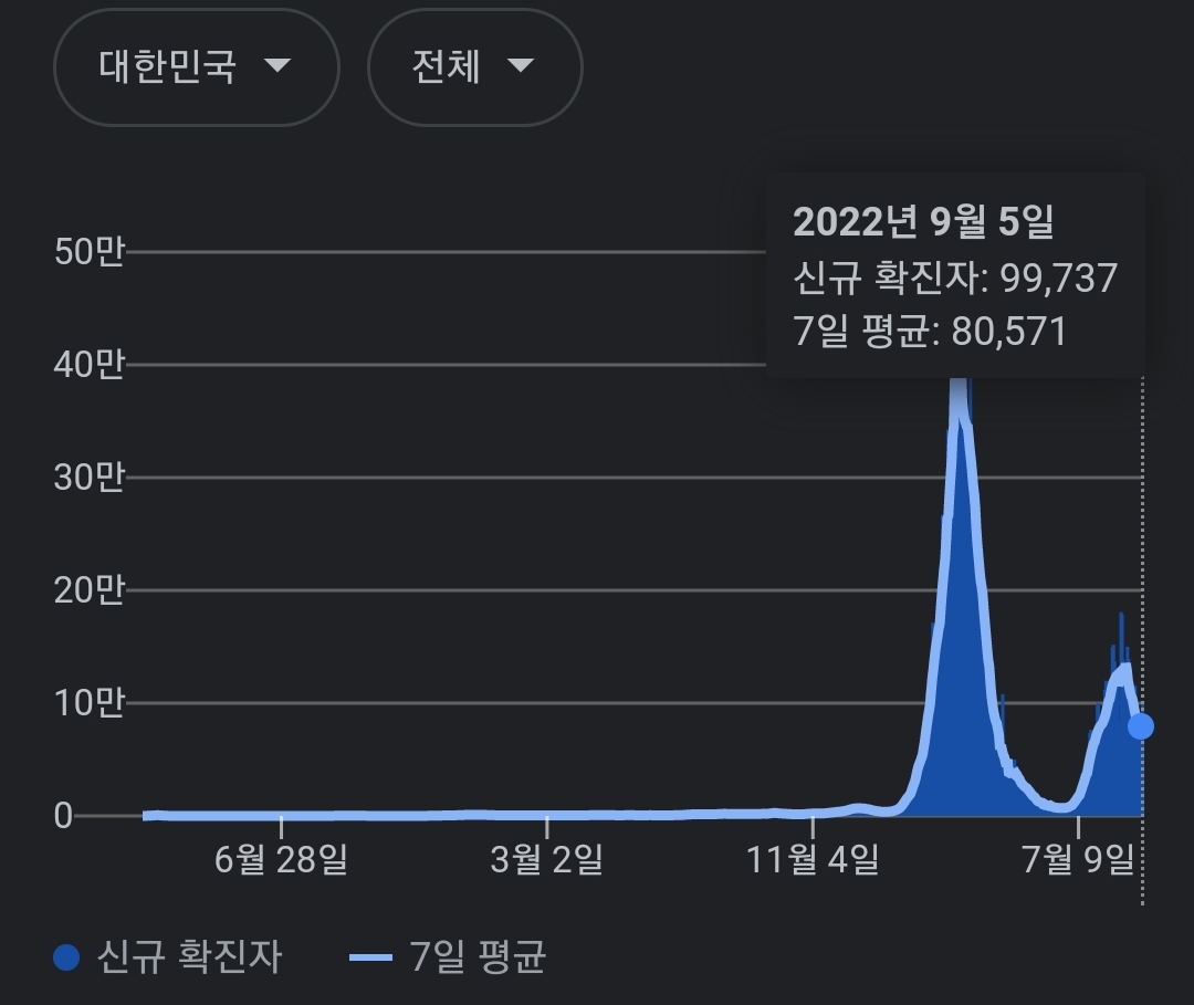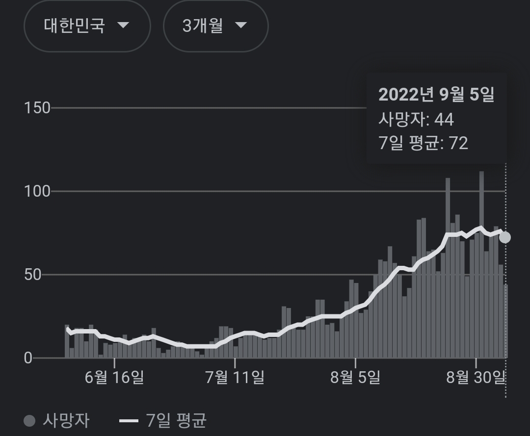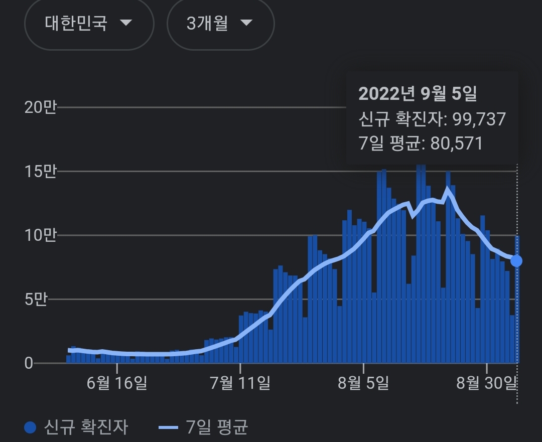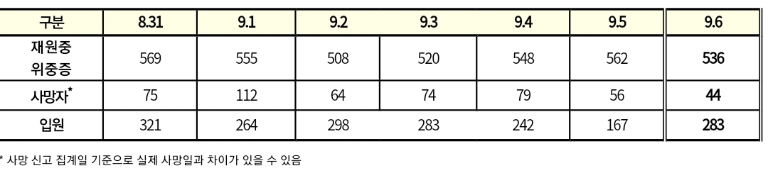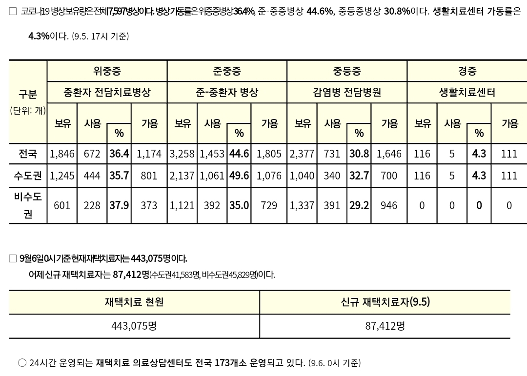 코로나19집계(2022.9.6. 0시기준) 확진 +10.0만, 사망 +44명, 중환자병상가동률 36%, 재택치료 44만 본문