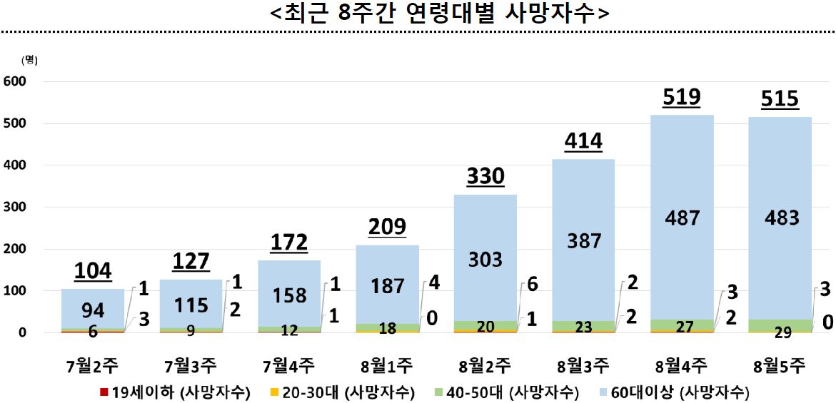 60세 이상 확진자규모도 감소하고 있지만, 다른 연령대보다는 감소세가 적어 비중은 증가.