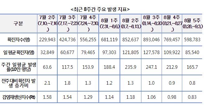 코로나19 주간 발생 동향 및 위험도 평가: 감염재생산지수(Rt) 0.83