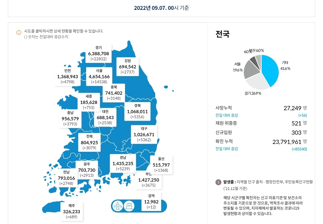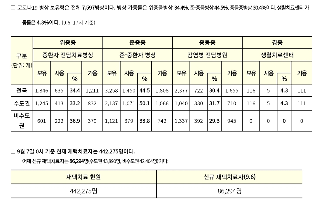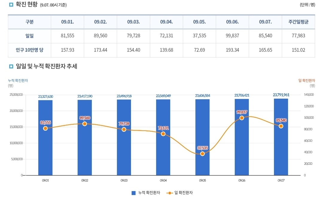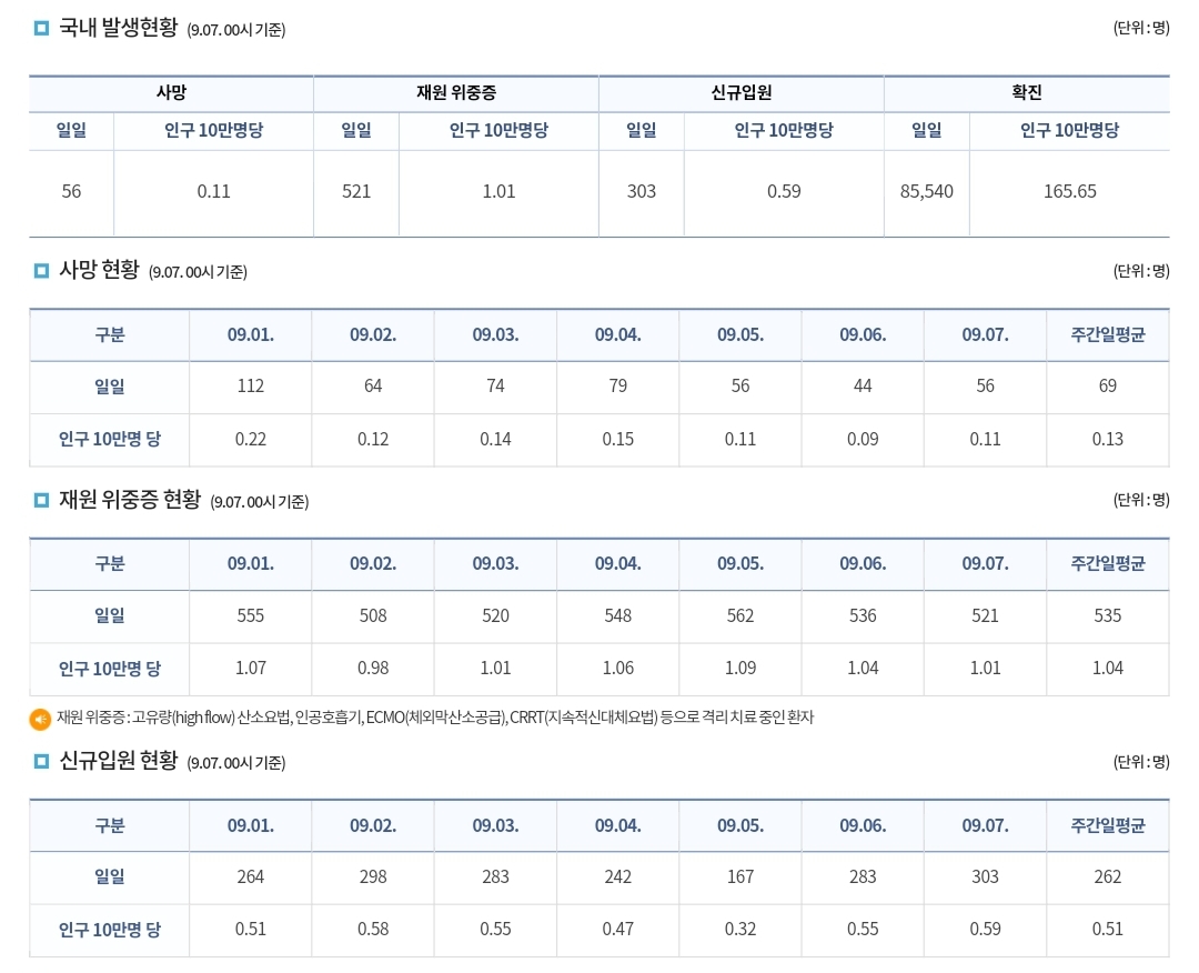 코로나19집계(2022.9.7. 0시기준) 확진 +8.6만, 사망 +56명, 중환자병실가동률 34%, 재택치료 44만 본문