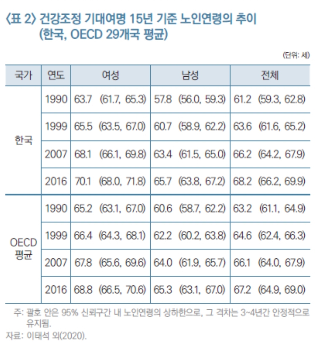 "시간이 지남에 따라 건강상태가 개선되며 전 세계적으로 전 연령에 걸쳐 기대여명과 생존 확률이 증가하고 있다. 이 에 따라 일정한 기대여명을 기준으로 이론적 노인연령을 산정할 경우, 장기에 걸쳐 노인연령이 지속적으로 상향 조정될 것으로 예상된다. 이론 적으로는 건강조정 기대여명을 노인연령의 기준 으로 삼는 것이 가장 합리적일 수 있다. 다만, 전망의 불확실성과 의료자료 공개 제한 등의 어려움을 고려할 때 기대여명 기준 노인연령을 바탕 으로 개선 폭과 격차의 안정성에 관한 논의를 추가적으로 진행하는 것이 실용적인 접근이 될 것으로 생각된다." - KDI