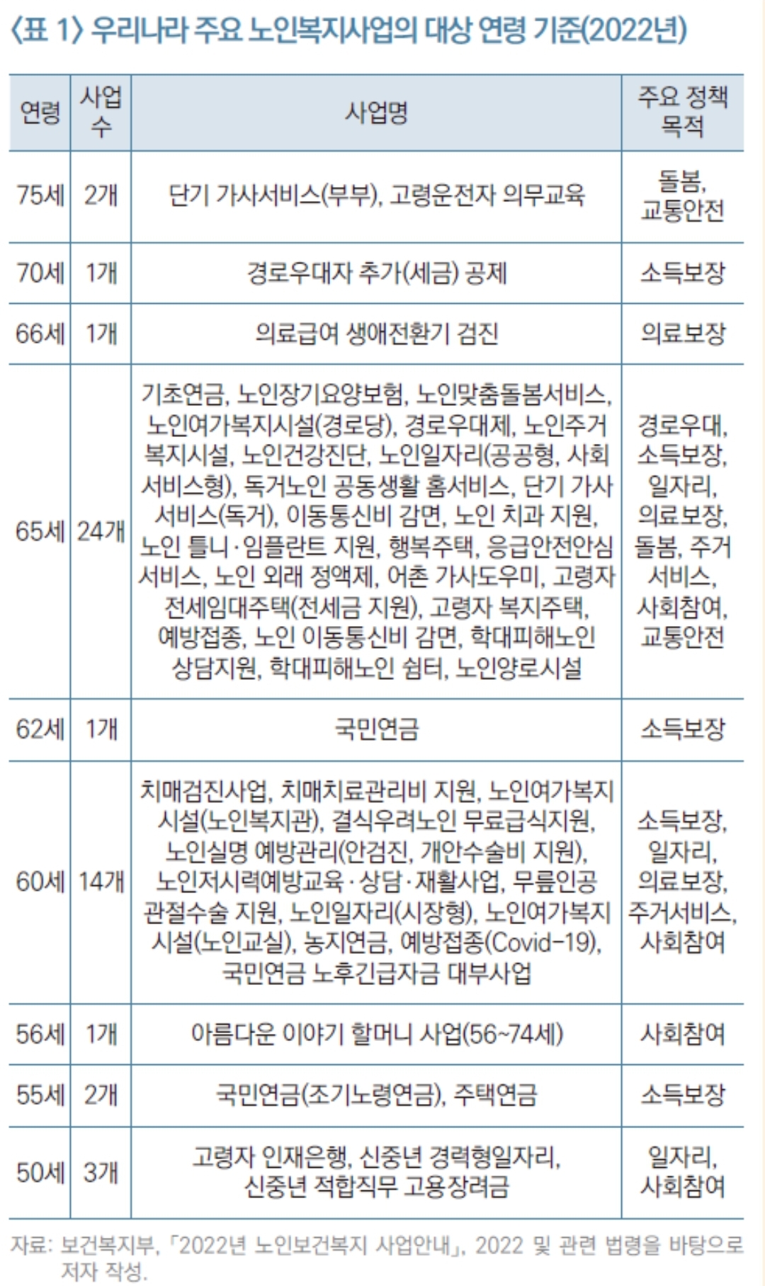 국민의 기대여명(수명)이 길어지면서 65세 이후 건강하게 살 수 있는 기간1도 늘고 있다. 한편 부양비용의 국가재정부담은 커지고 있다. 그러므로 노동관계법령 및 사회복지제도에서 노인연령 나이를 고정하지 말고 기대여명에 따라 연장할(미룰) 필요가 있다..