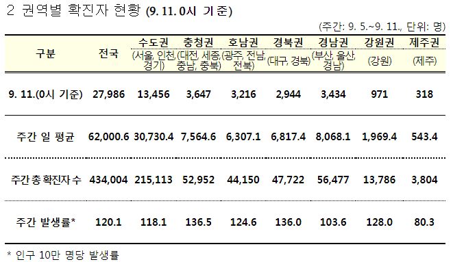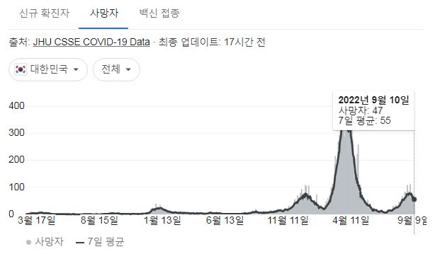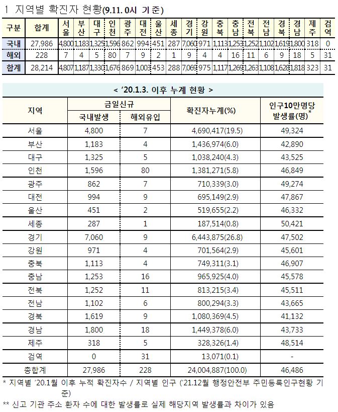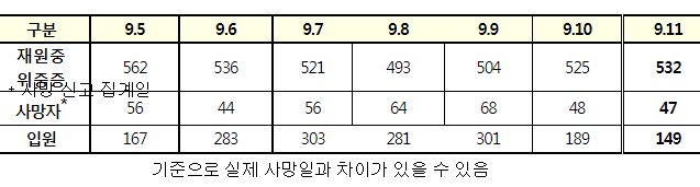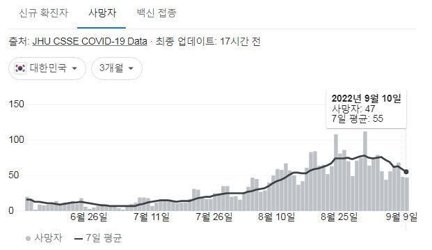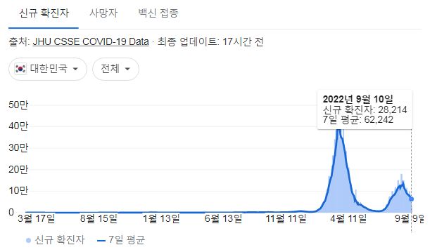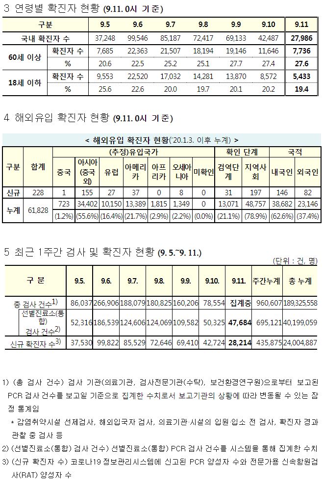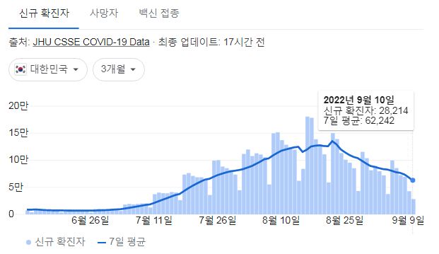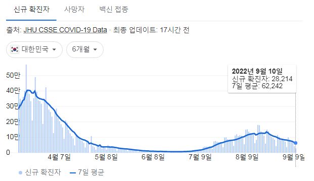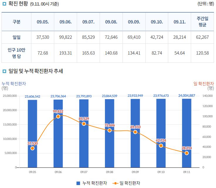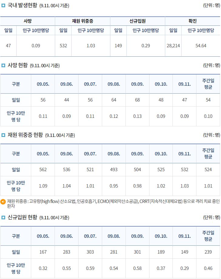 코로나19집계(2022.9.11. 0시기준) 확진 +2.8만, 사망 +47명, 중환자병상가동률 33%, 재택치료 38만 본문