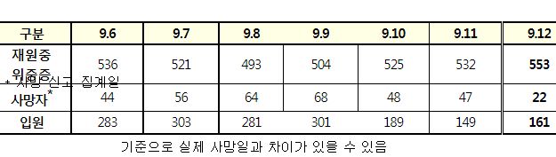 | 코로나19(2022.9.13) 주간 확진자 전주대비 2할 감소 (0) | 2022.09.13 |