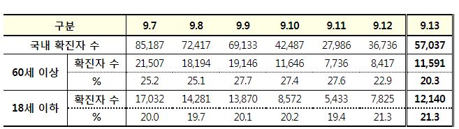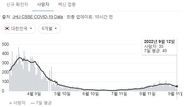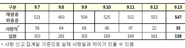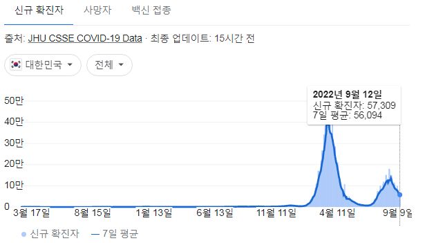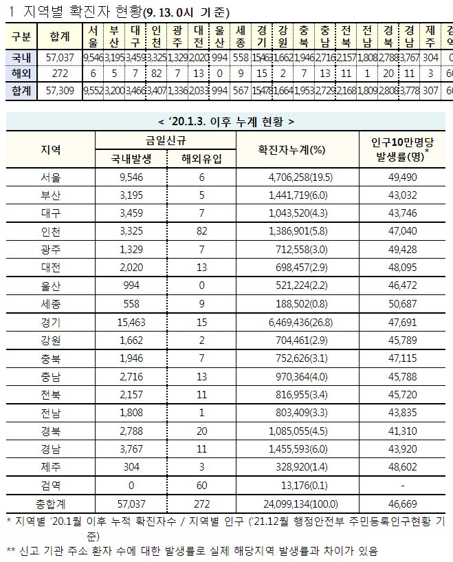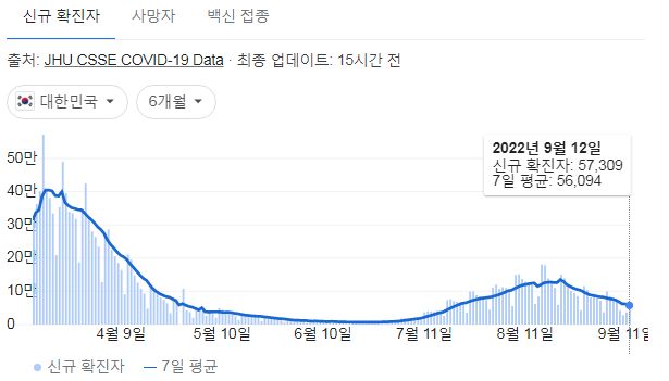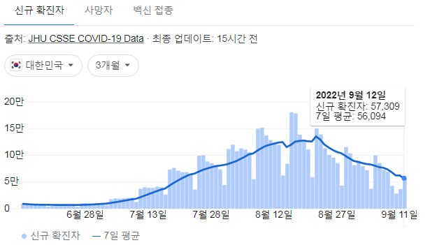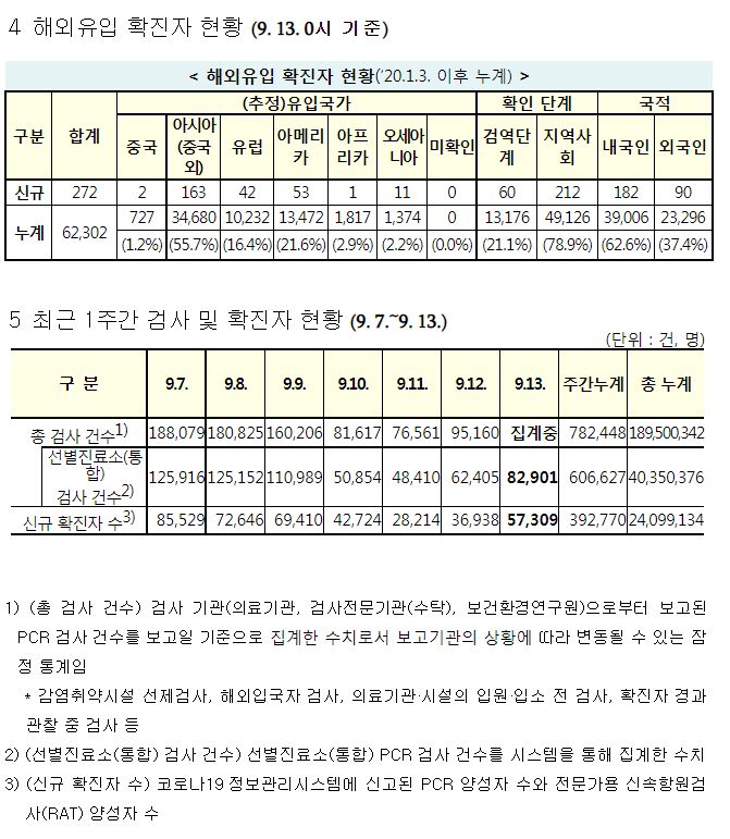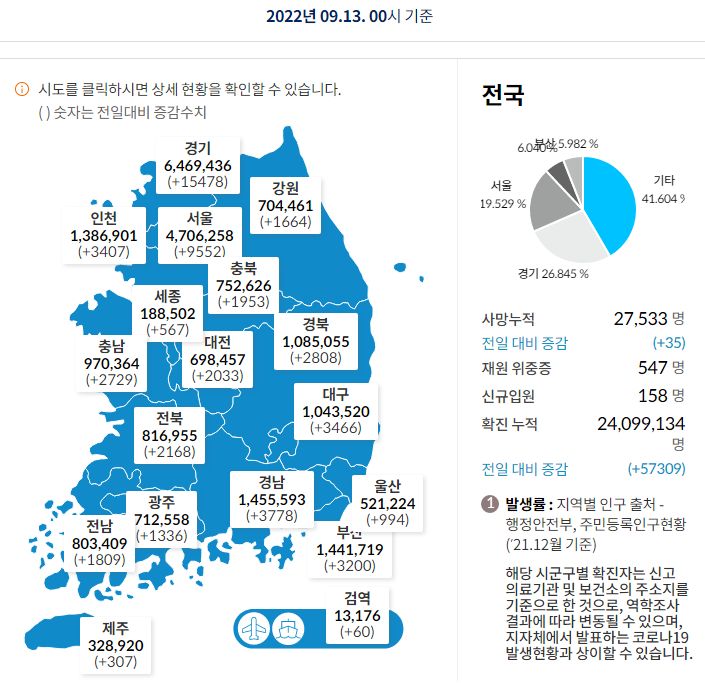 코로나19집계(2022.9.13. 0시기준) 확진 +5.7만, 사망 +35명, 중환자병상가동률 30%, 재택치료 30만 본문