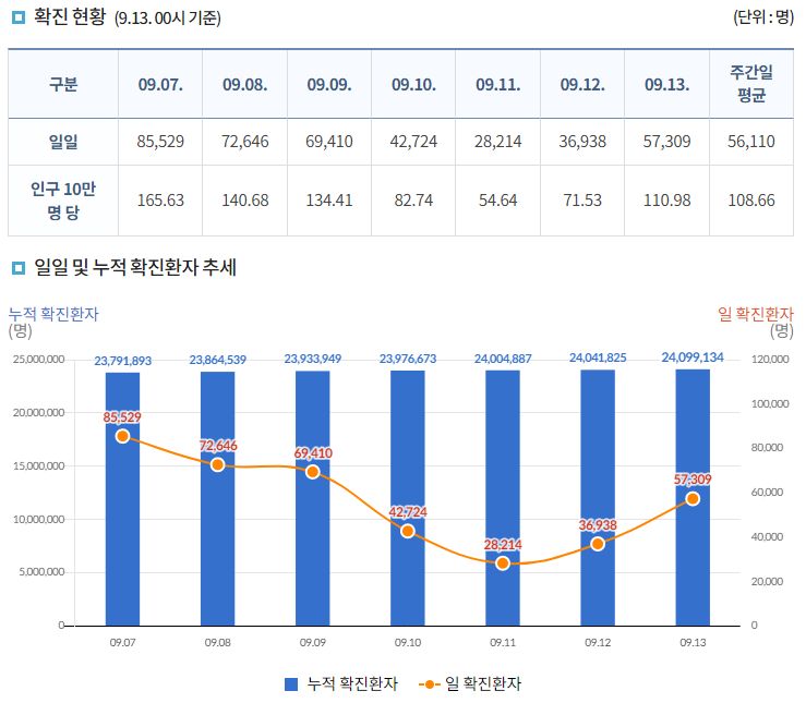 코로나19집계(2022.9.13. 0시기준) 확진 +5.7만, 사망 +35명, 중환자병상가동률 30%, 재택치료 30만 본문