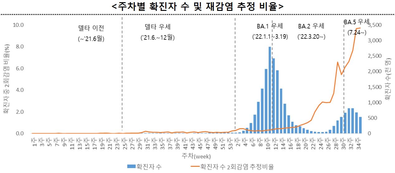 ○ 주간(8.28~9.3) 확진자 중 재감염 추정사례 비율 9.72%로 전주(9.66%) 대비 증가