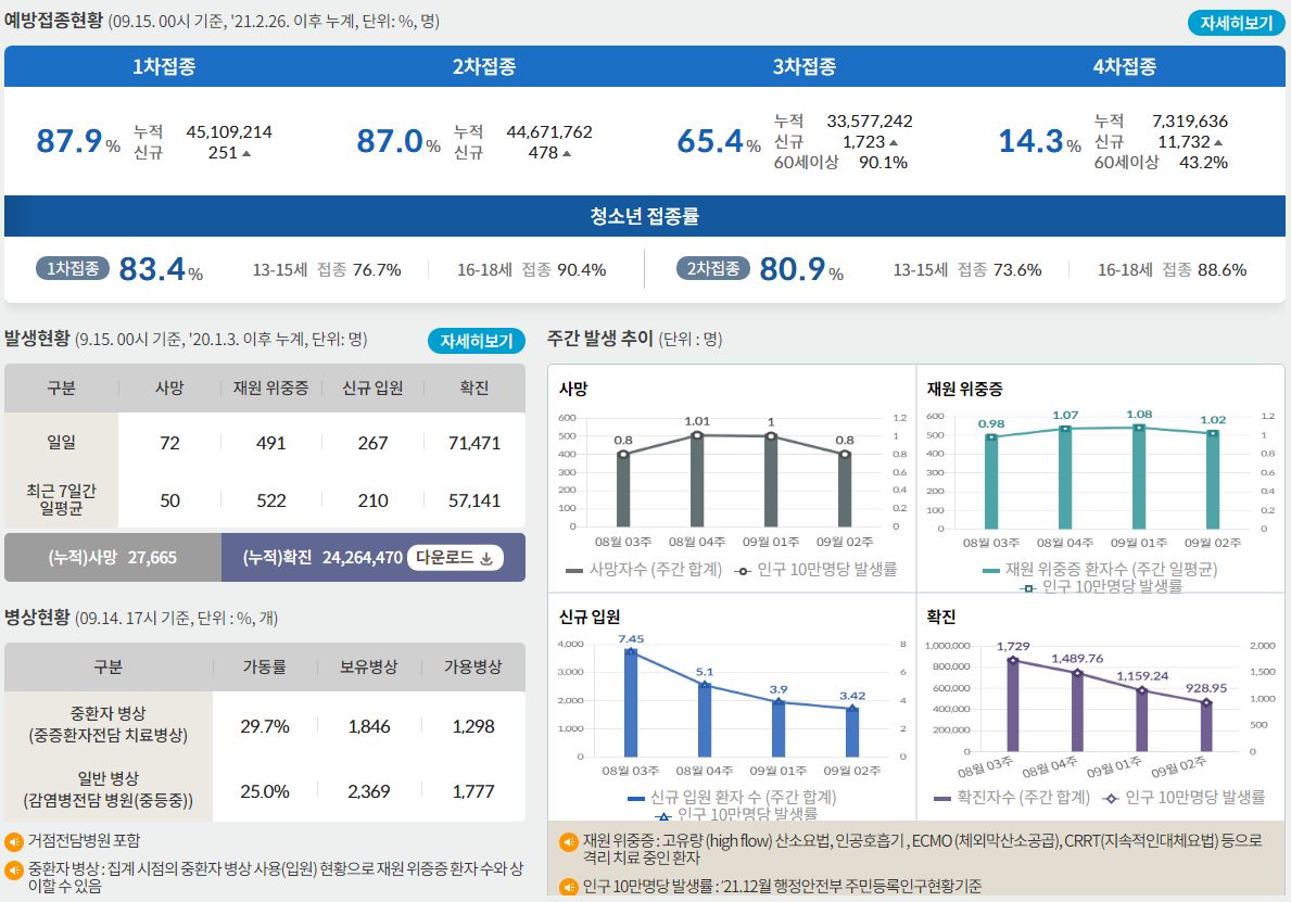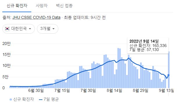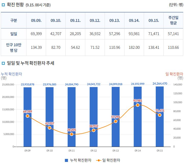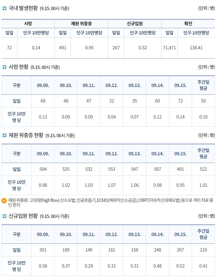 코로나19(2022.9.15. 0시기준) 확진 +7.1만, 사망 +72명, 중환자병상가동률 30% 본문
