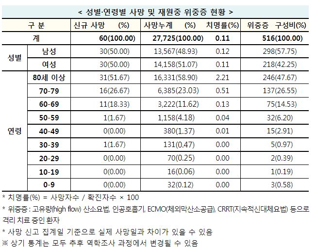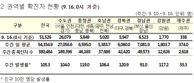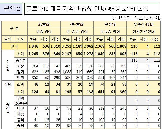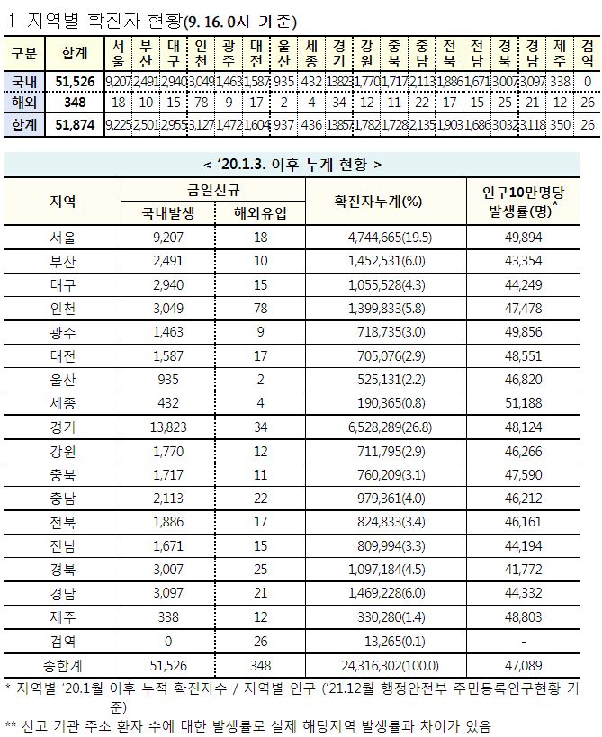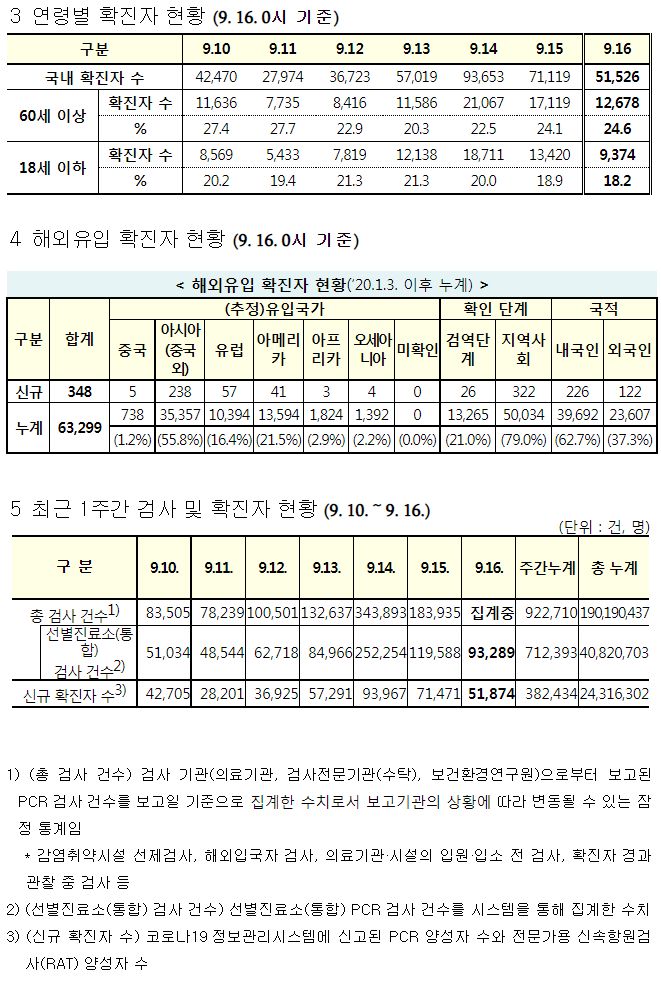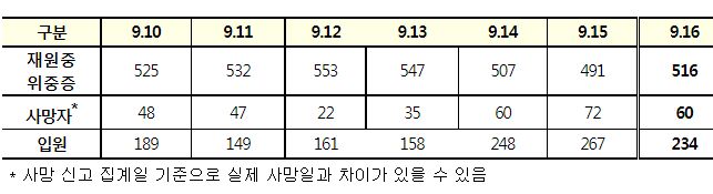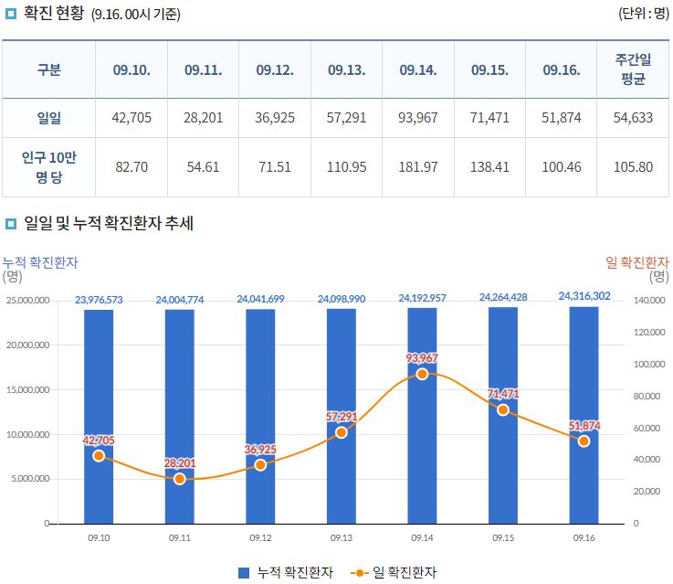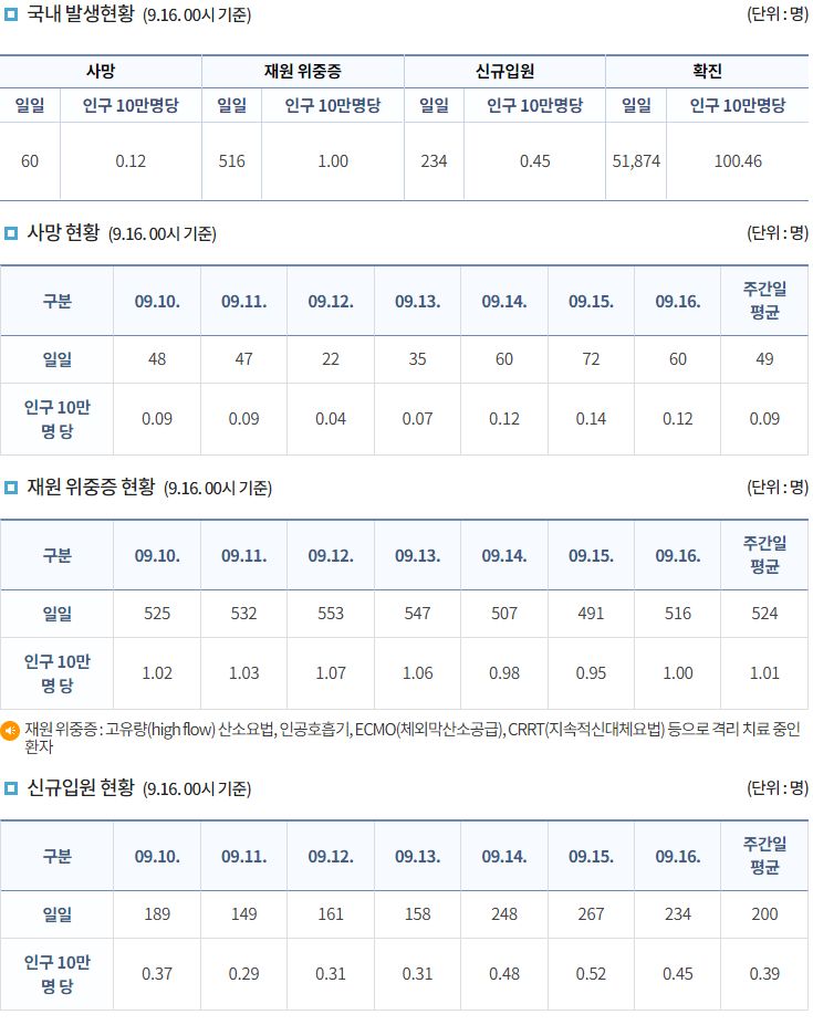 코로나19집계(2022.9.16. 0시기준) 확진 +5.2만, 사망 +60명, 중환자병상가동률 29%, 재택치료 33만 본문